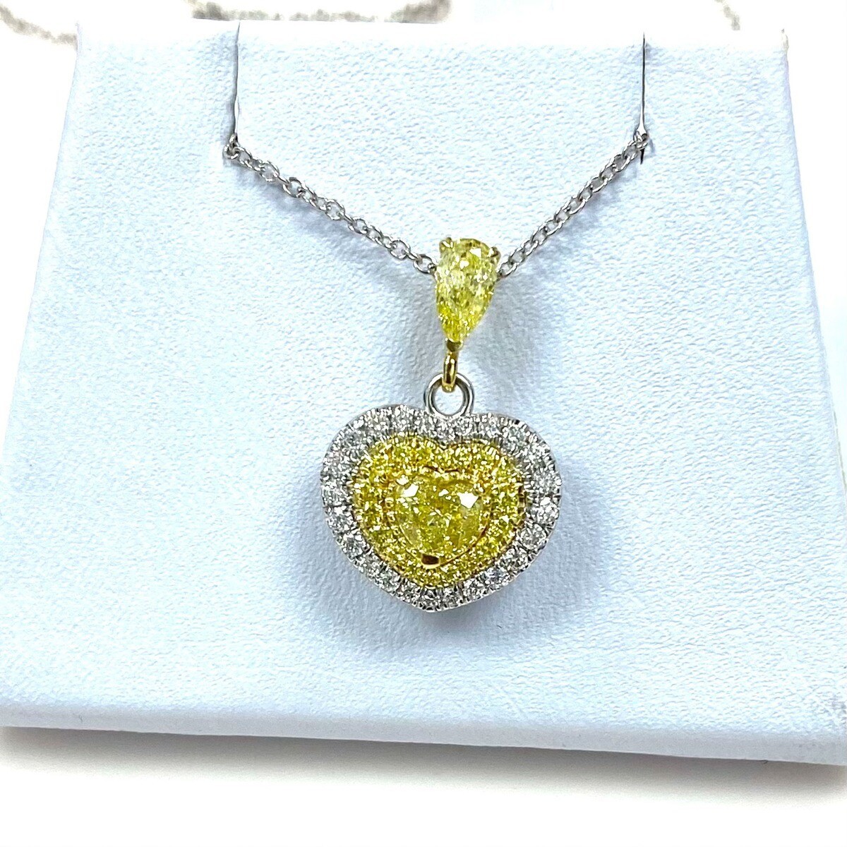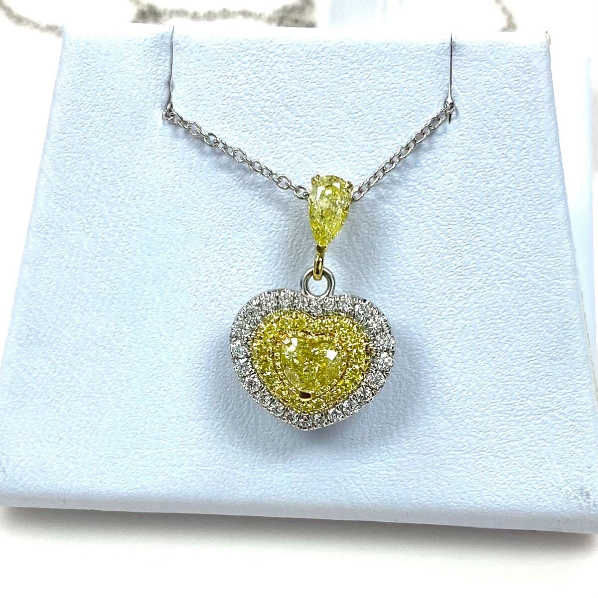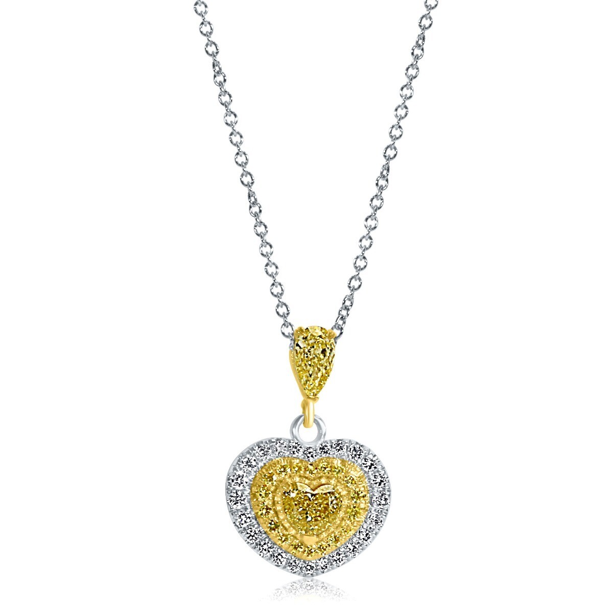 Ein 0,31 Karat herzformiger gelber Diamantanhanger mit einer schicken, hellgelben Diamanten mit einer 16-Zoll-Rolo-Kette von Birnen und einer kleineren runden Seite von 0,29 karat, klingt wie ein wunderschones Schmuckstück !!! Der Anhanger selbst verfügt über einen herzformigen gelben Diamanten als Herzstück, das von kleineren runden Diamanten an den Seiten umgeben ist. Der gelbe Diamant ist wahrscheinlich der Schwerpunkt des Anhangers und verleiht dem Gesamtdesign eine lebendige und einzigartige Note!