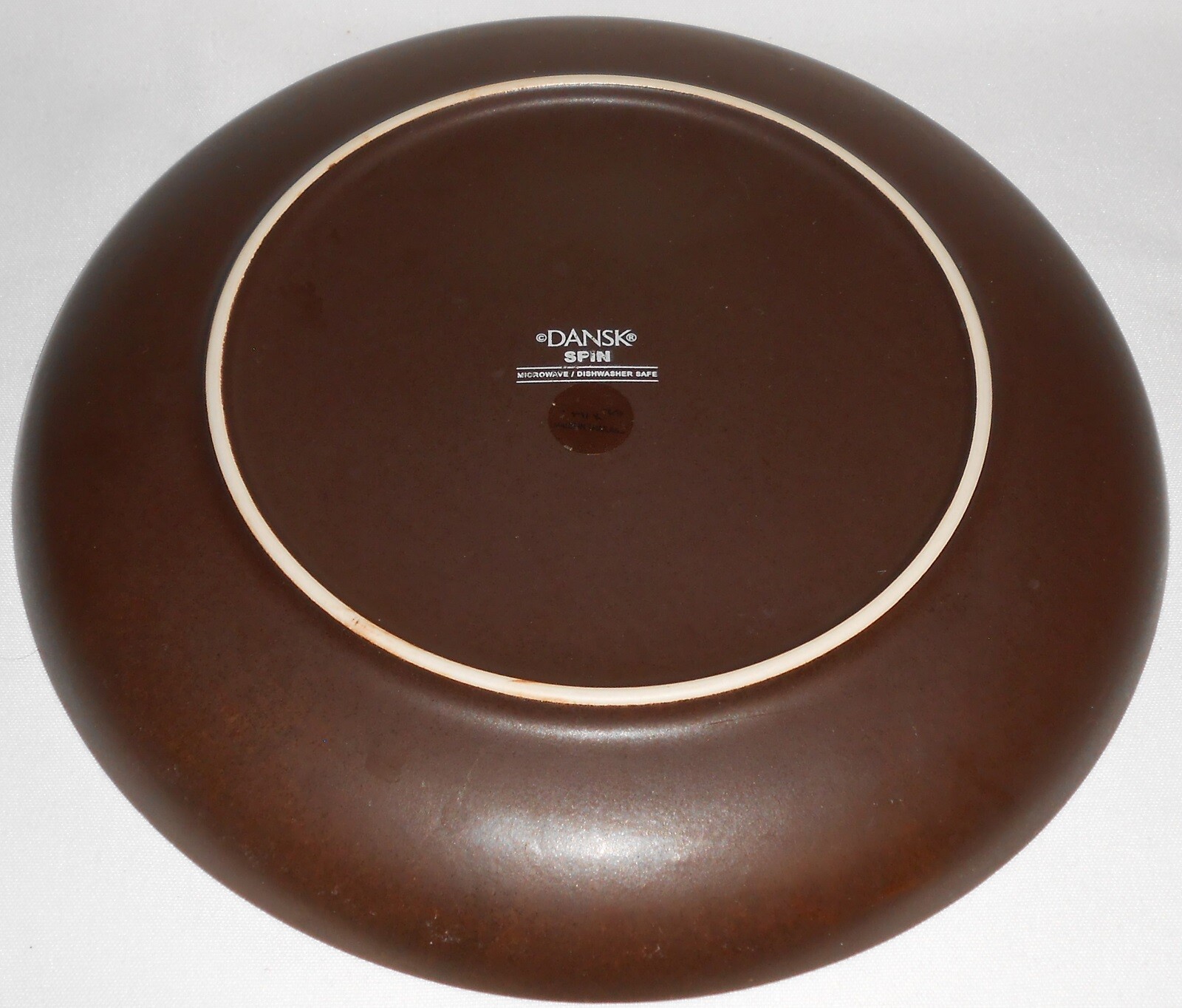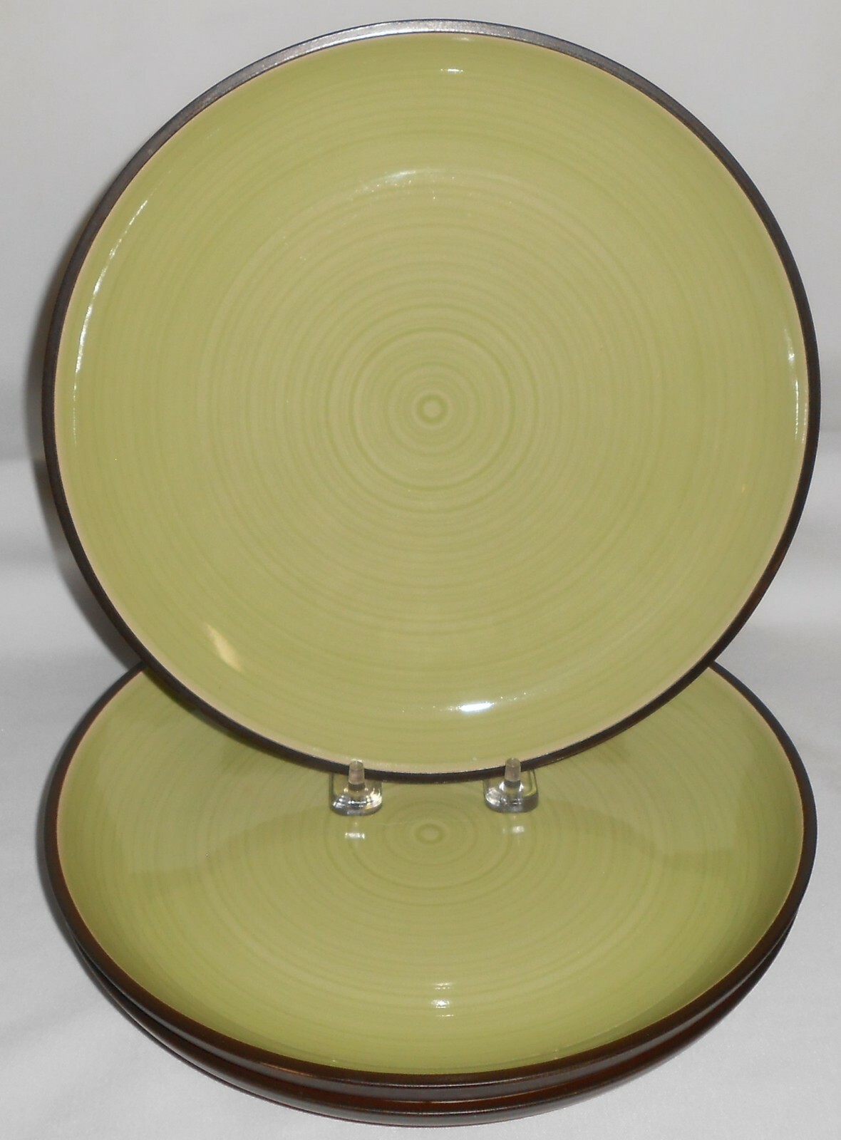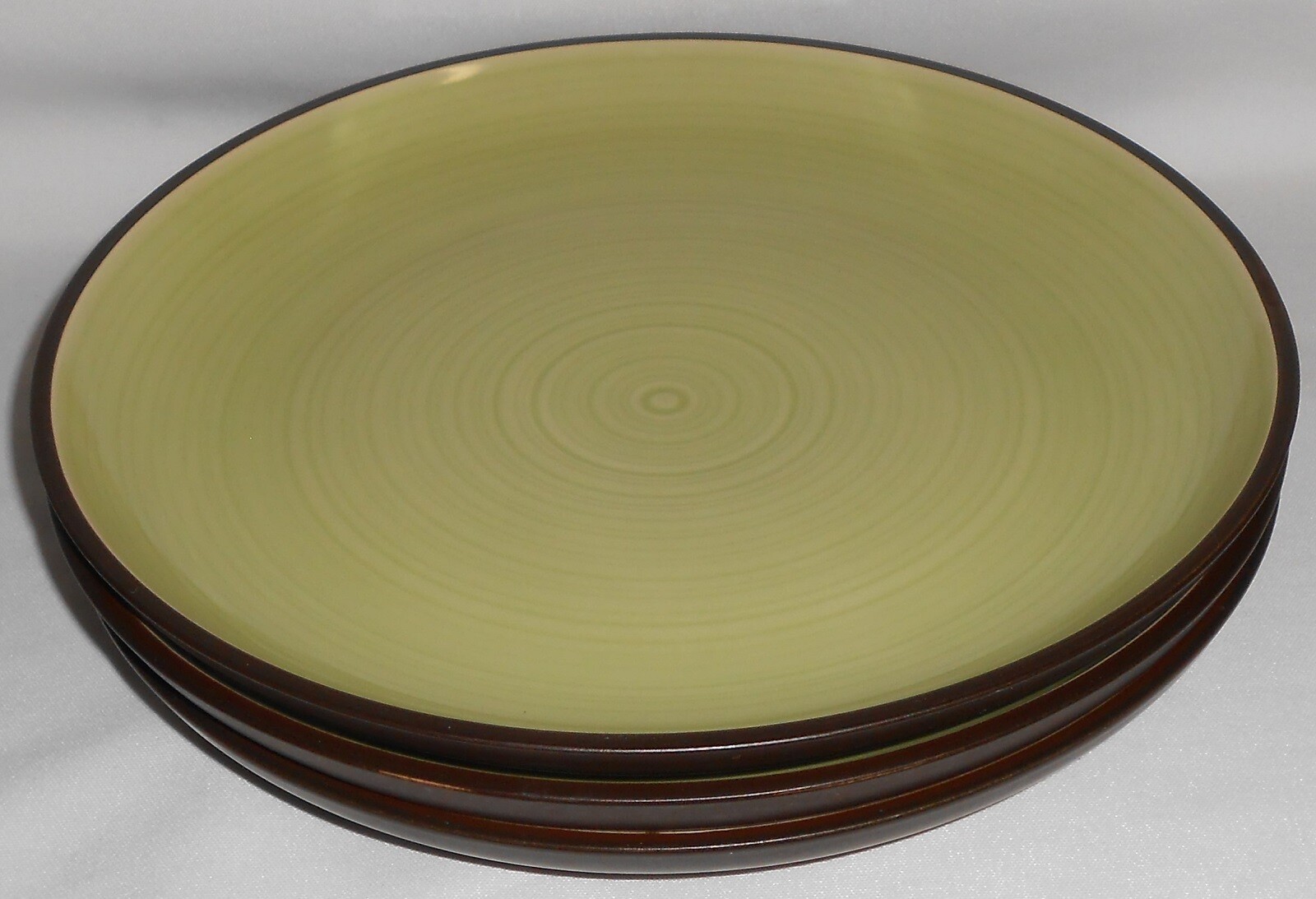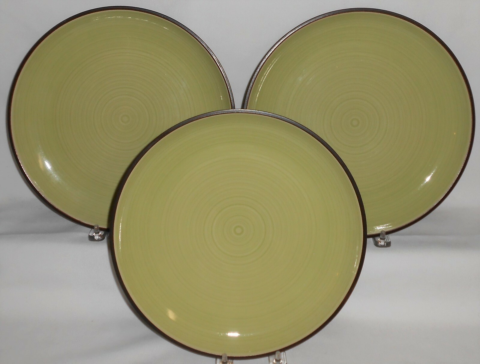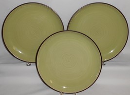 This is a Set of (3) 10 1/2" Stoneware Dinner Plates from Dansk in the Spin Green Pattern. They are all in good pre-owned condition with no chips or cracks.