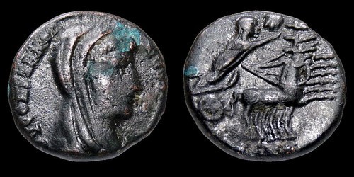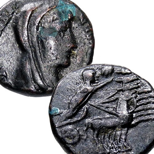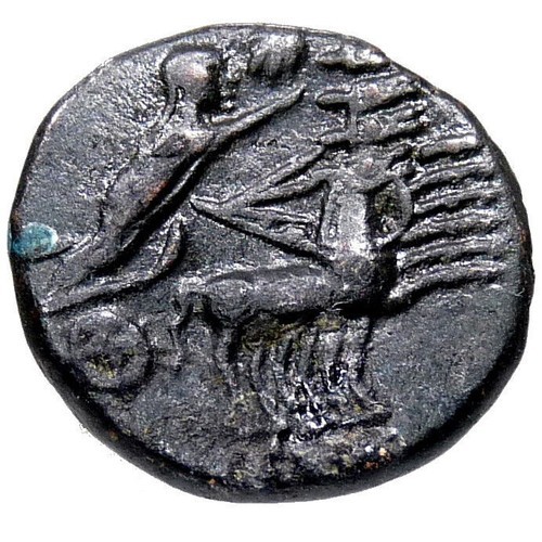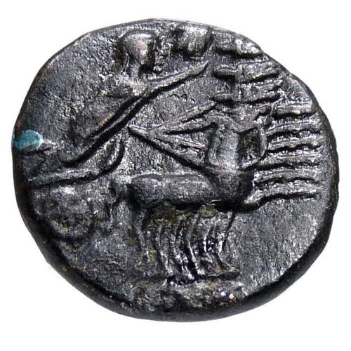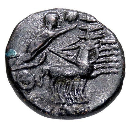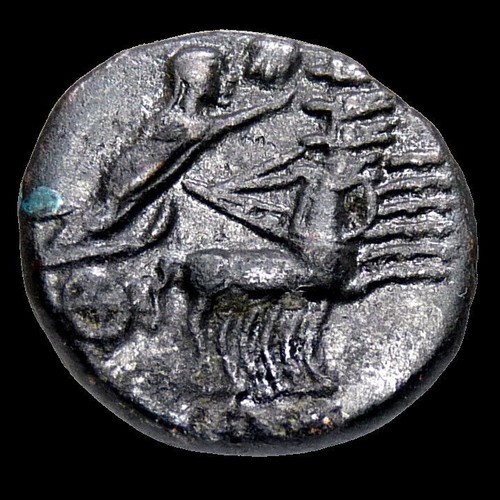 This remarkable coin depicts Constantine the Great being flown up to heaven in a chariot pulled by four horses (Quadriga)
