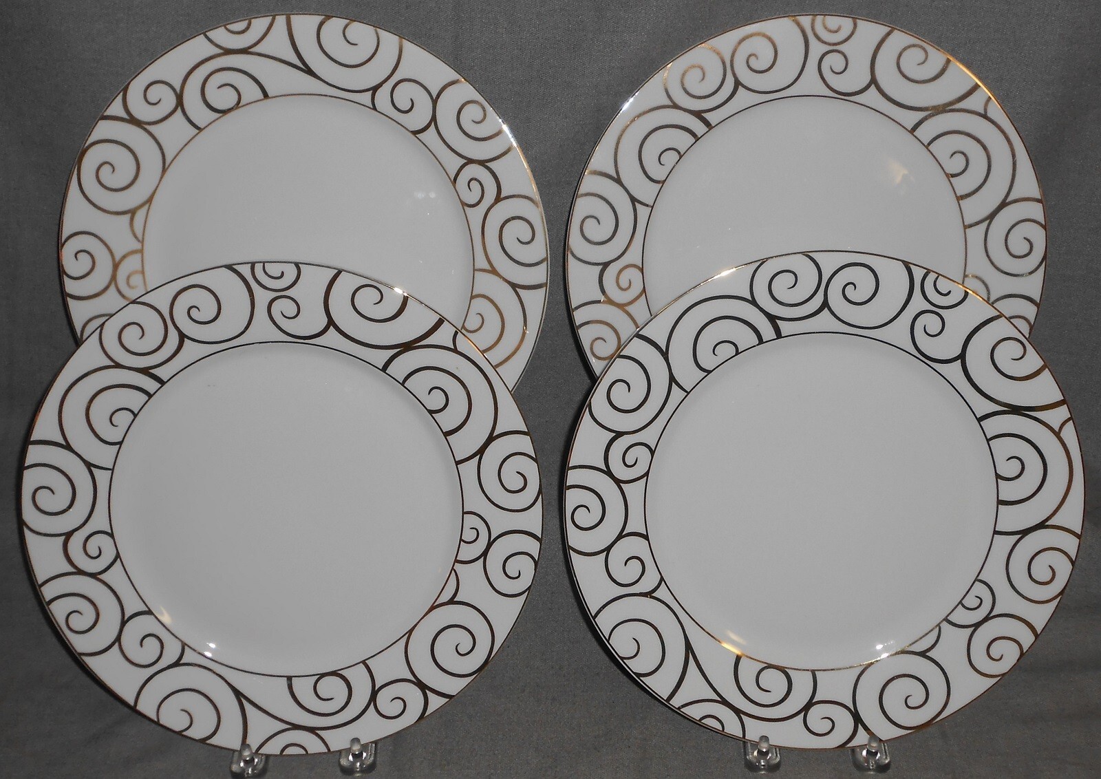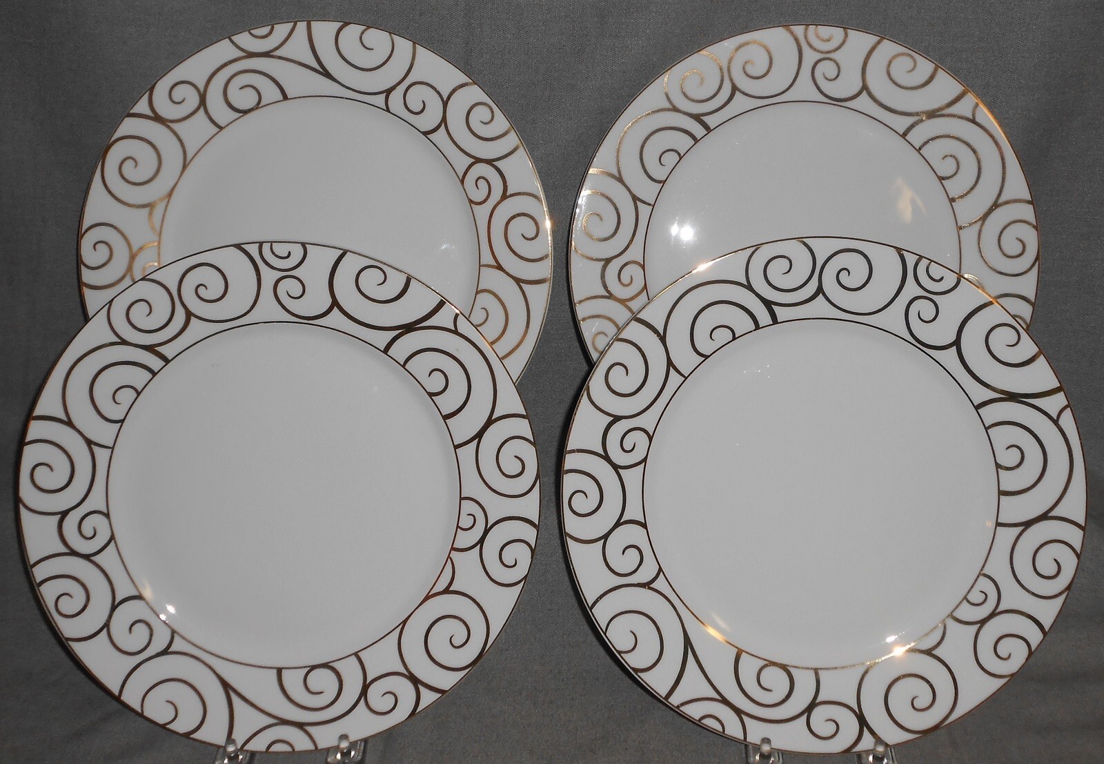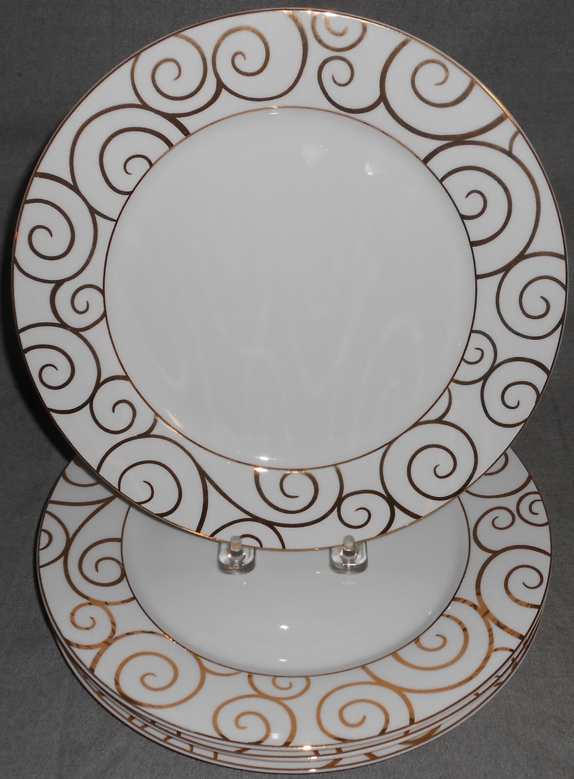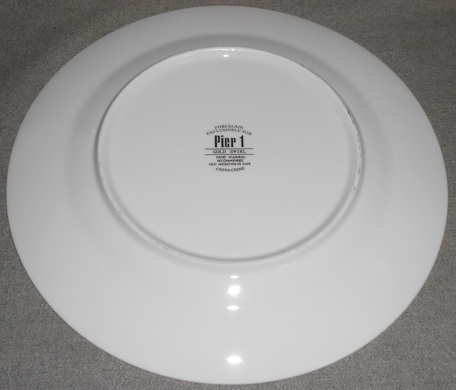 This is a Set of (4) 10 1/4" Porcelain Dinner Plates from Pier 1 in the Gold Swirl Pattern. They are all in good pre-owned condition with no chips or cracks.