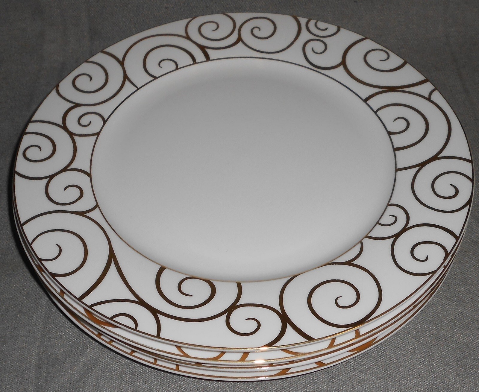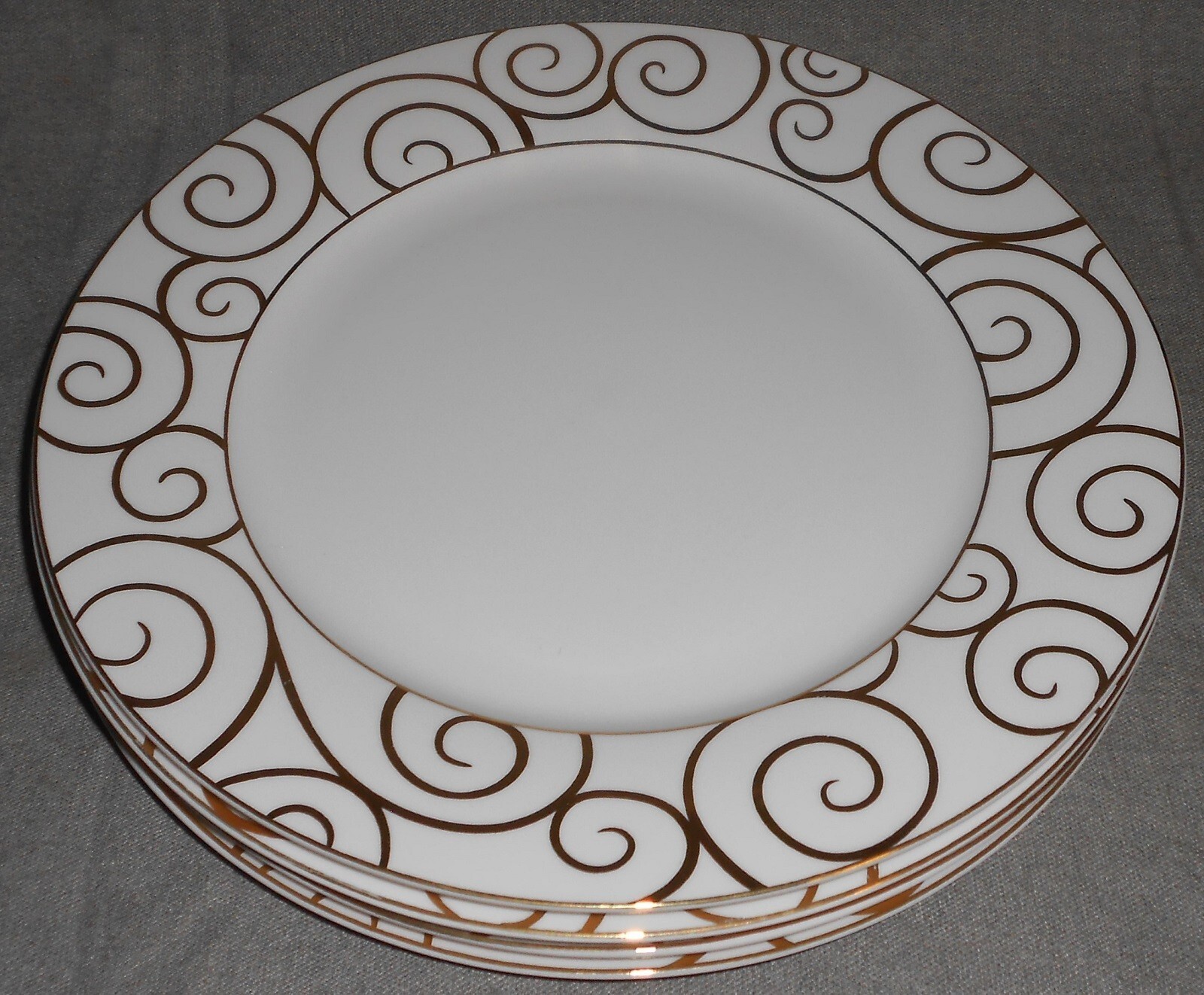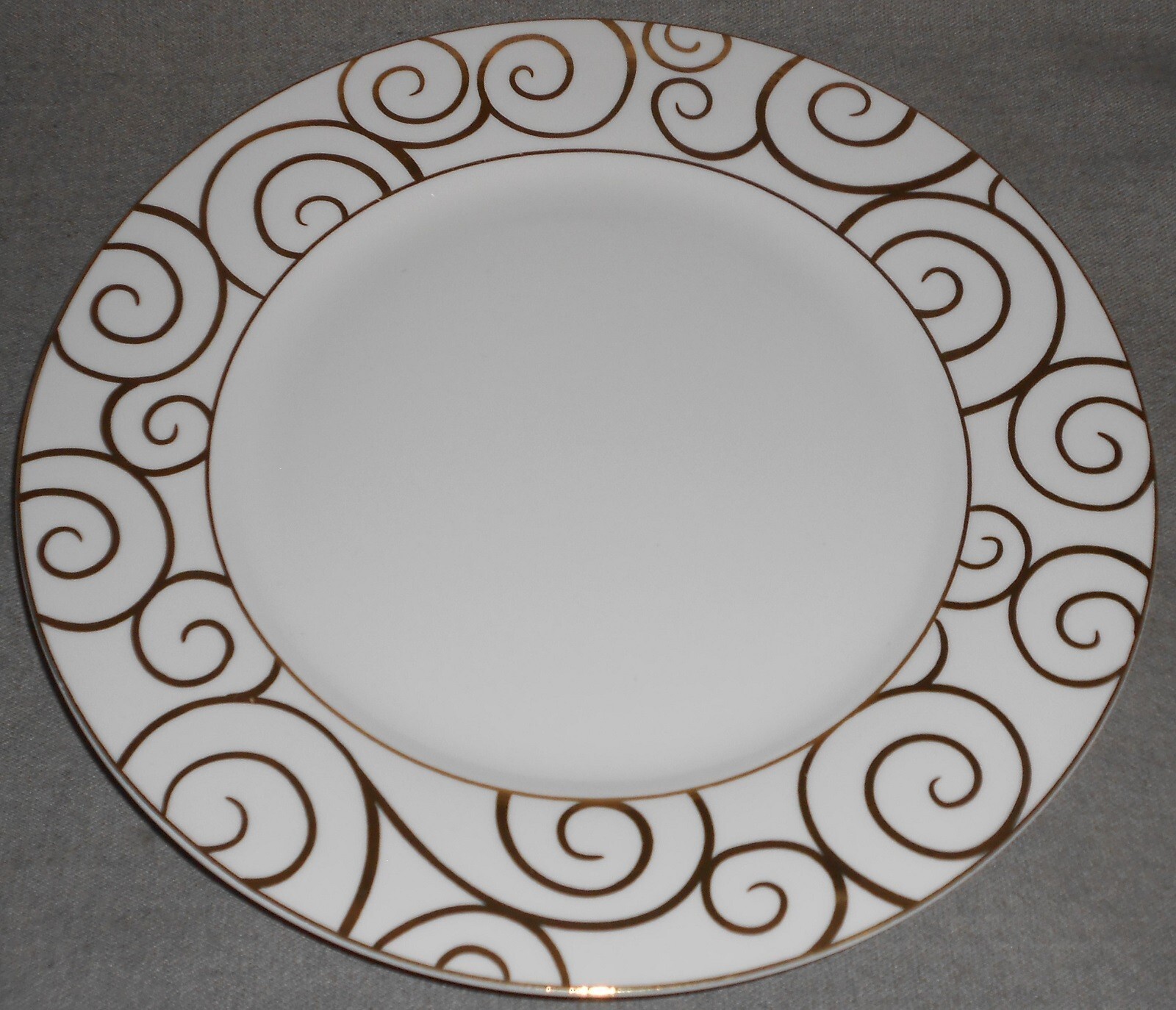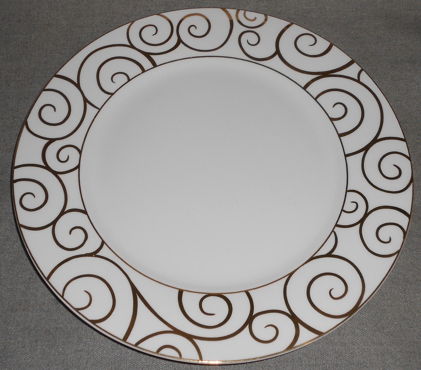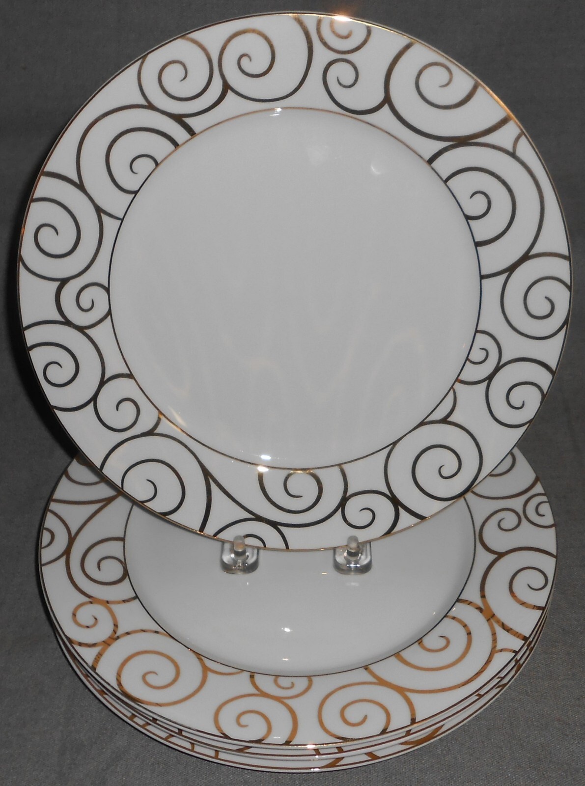This is a Set of (4) 10 1/4" Porcelain Dinner Plates from Pier 1 in the Gold Swirl Pattern. They are all in good pre-owned condition with no chips or cracks.