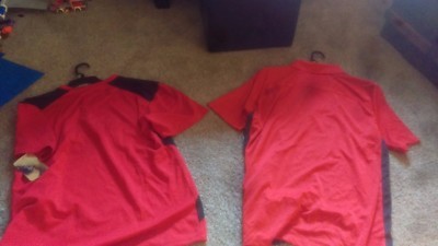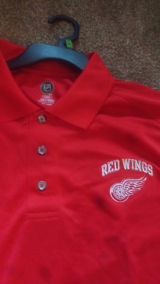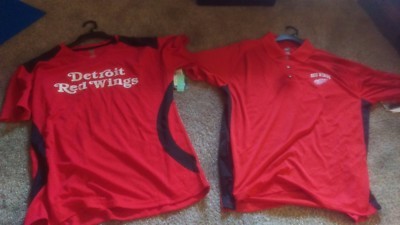 Il s'agit de 2 chemises a ailes rouges. L'un a un collier et est plus habille et l'autre est plus de type Jersey (pas de chiffres). Les deux sont nouveaux et en excellent etat. Les deux sont de taille grande. Les deux sont officiels de la LNH.