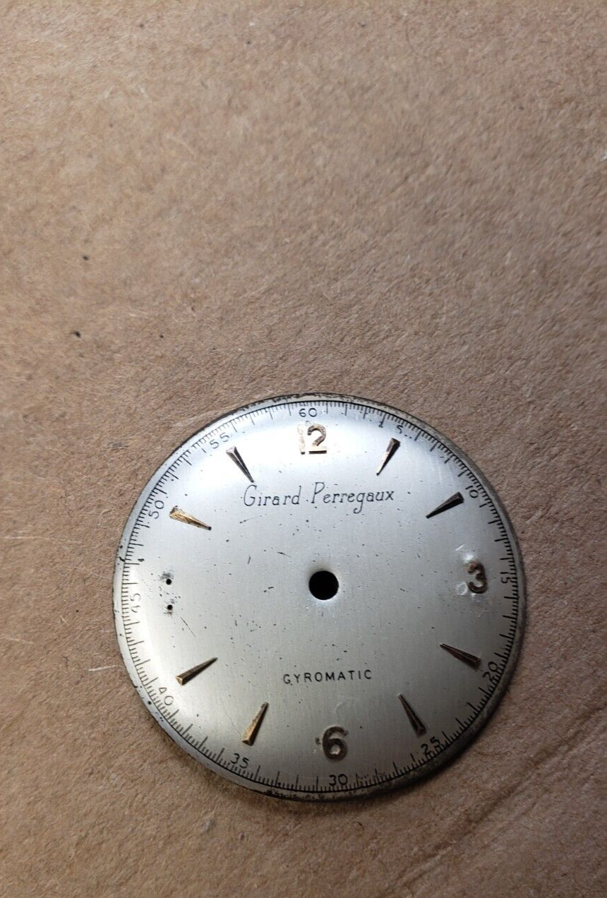 VTG 1950's 60's Girard Perregaux gyromatic Silver Watch Dial w/ Gold Markers 27mm - I am not an expert. If you know something more about this watch please let me know.....? Like what watches it is compatible with...?? this is a piece of history. If you fix old watches you are in luck. I am not an expert on watches. I bought a big lot of old watch parts from a family watch-repair business that went to auction. They had been in business for 100 years. PLEASE - check out my other vintage watch parts we will be listing more over the next number of months. I will give you a deal if you want multiple orders!! FREE USA SHIP