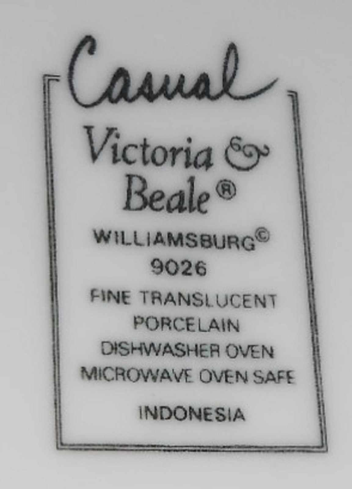 This is a set of (6) 6 1/4" Saucers and (6) 2 1/4" Tall Handled Cups from Victoria Beale in the Fine Translucent Porcelain Williamsburg Pattern. All six are in good pre-owned condition with no chips or cracks.