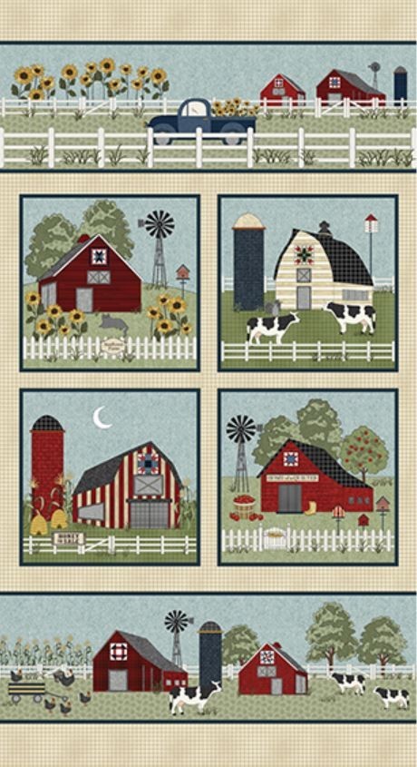 24" X 44" Panel Heartland 10'' Squares Cheryl Haynes Barns Farmyard Animals Benartex Cotton Fabric Panel (3353-70)