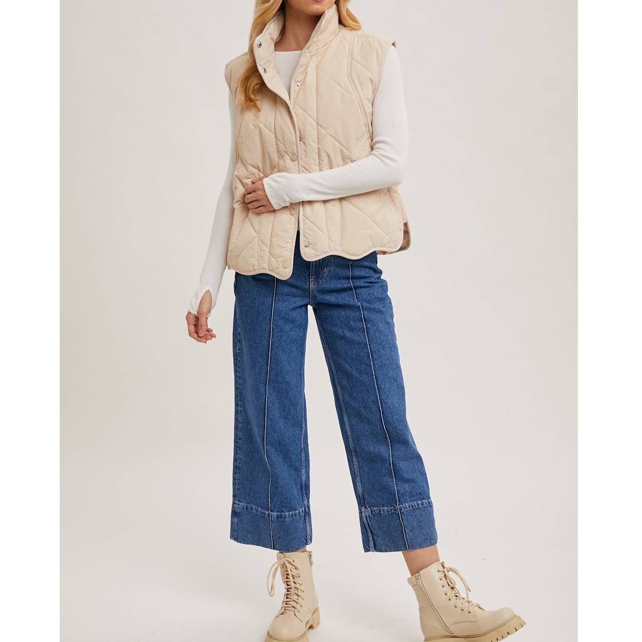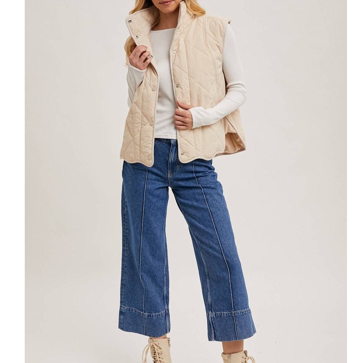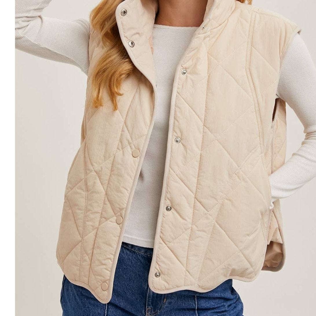 Button Down Quilted Puffer Vest with Pockets Creamy Beige
