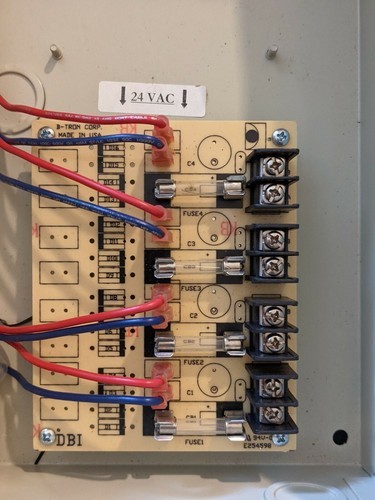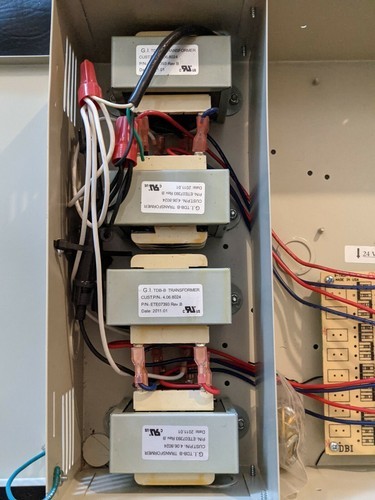 A vendre est un armoire de controle de securite CCTV interlogix d'occasion 4 Transformers TDB-B Fuse Fusible. L'armoire comprend 4 transformateurs GI TDB Sortie B-Tron Corp 4