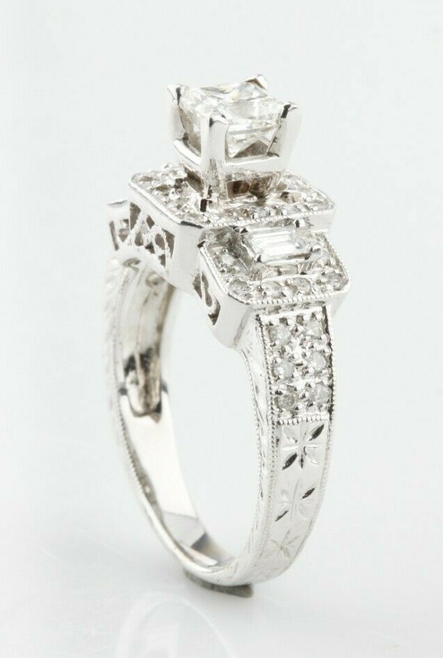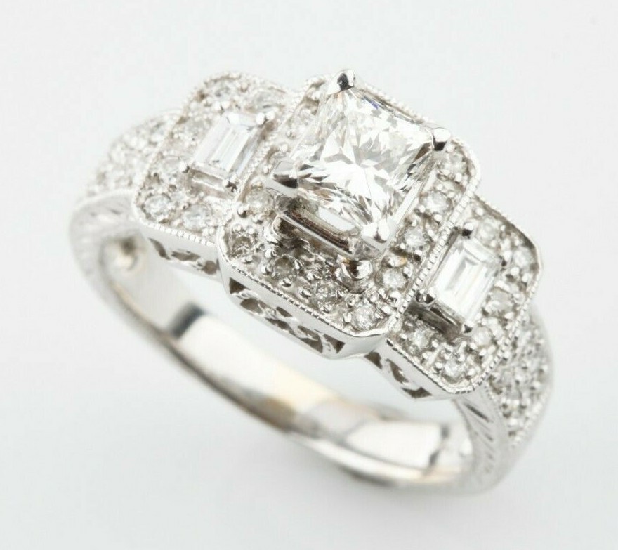 Une bague en or blanc 14 carats testee electroniquement pour femme avec diamants moules avec une finition brillante et a motifs.