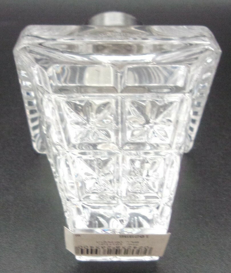 Using Irish craftsmen and their techniques of glass blowing together with artful cuts, this beautiful sparkling clear, beveled and cut designed ornament bears four 2.5" sides at the top that taper down with sparkling rays in squares until they meet the four 1" sides at the slender bottom, designed with perfect balance for the option of standing the ornament on a mantel for display, or for hanging by its silver metal top with red satin ribbon.