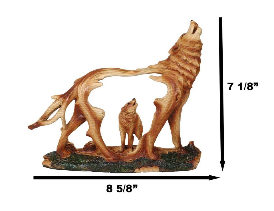 ? This beautiful faux wood howling wolf figurine is 7.25" tall, 8.75" long and 2" deep approximately.