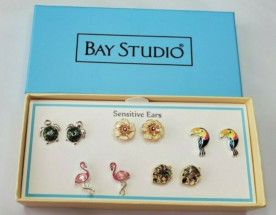 Bay Studio Stud Back Earrings 5 Pair Sensitive Ears Flamingos Toucans Turtles