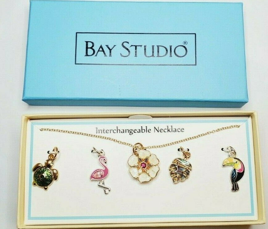 Bay Studio boxed interchangeable necklace with 5 pendants. New in box. Necklace is 17.5 inches long with a 2.5 inch extension. Lobster clasp. Pendants are .75 to 1 inch. Not intended for children under 12 due to choking hazard.