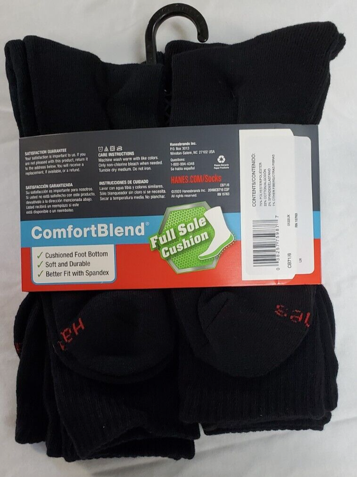 Hanes Men's Crew Socks. New in package. 6 pairs. Shoe size 6-12. Black. Comfort blend. Cushioned foot bottom. Fresh IQ helps fight stinky feet. Soft and durable. Better fit with spandex.
