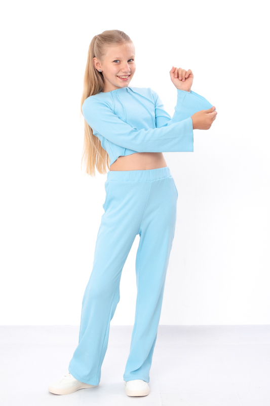 Teen girls? tracksuit made of ribbed knit ? a stylish, comfortable, and modern choice for youth. The set includes a cropped long-sleeve top with long sleeves and a high collar, and wide loose-fitting pants with an elastic waistband. The ribbed texture adds a trendy touch, while the soft, stretchy fabric ensures comfort and freedom of movement. The simple design with decorative pleats on the top makes the tracksuit expressive and fashionable. Perfect for school, walks, meetings, or relaxing. Easily combined with t-shirts, tops, or hoodies. A practical choice for teens who value style and comfort.
