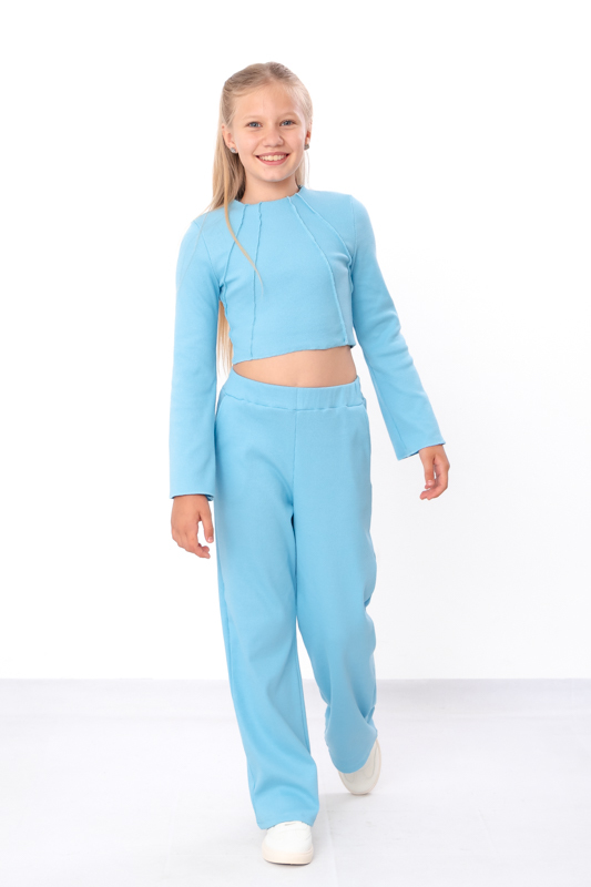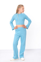 Teen girls? tracksuit made of ribbed knit ? a stylish, comfortable, and modern choice for youth. The set includes a cropped long-sleeve top with long sleeves and a high collar, and wide loose-fitting pants with an elastic waistband. The ribbed texture adds a trendy touch, while the soft, stretchy fabric ensures comfort and freedom of movement. The simple design with decorative pleats on the top makes the tracksuit expressive and fashionable. Perfect for school, walks, meetings, or relaxing. Easily combined with t-shirts, tops, or hoodies. A practical choice for teens who value style and comfort.