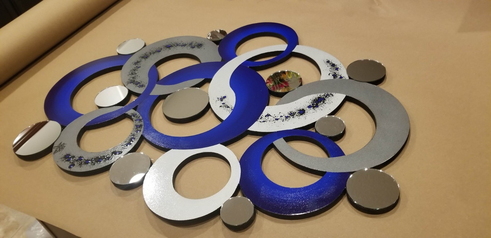 Acrylic on wood with a high gloss lacquer finish for shine and protection