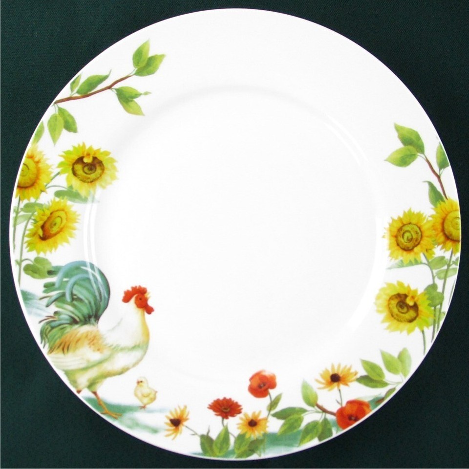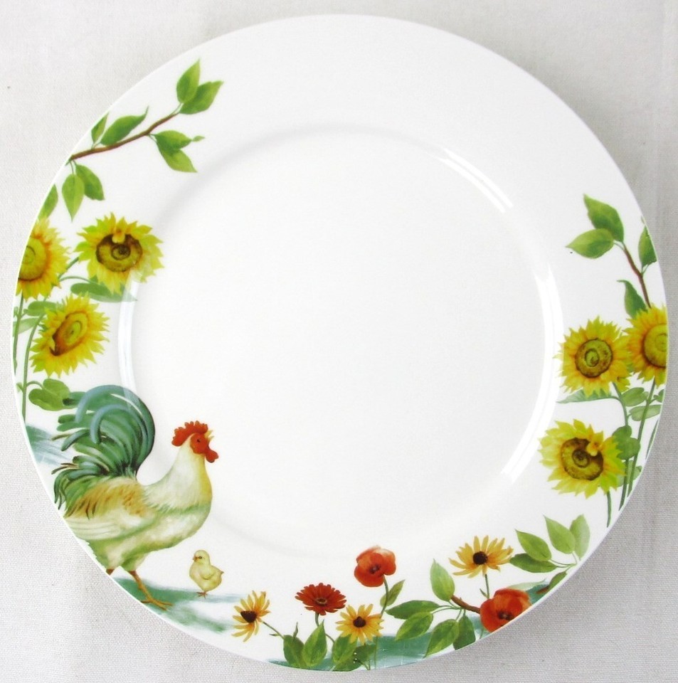 10-3/8" diameter dinner plate is white with a colorful rooster and sunflower theme around the rim