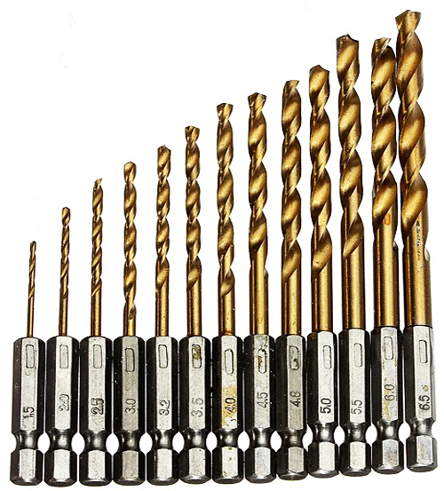 13 TITANIUM HSS DRILL BIT SET Wood/Plastic/Metal SMALL-LARGE 1/4" HEX SHANK C117