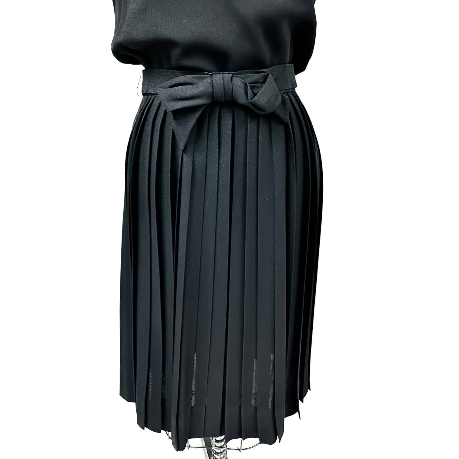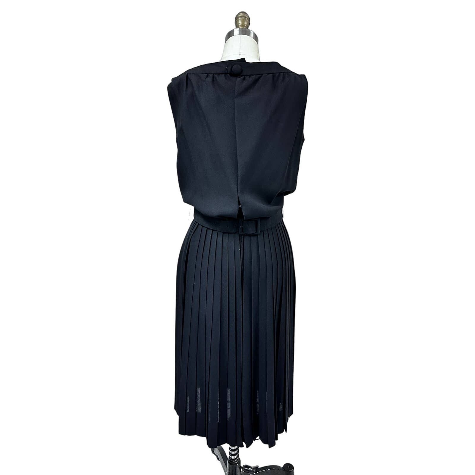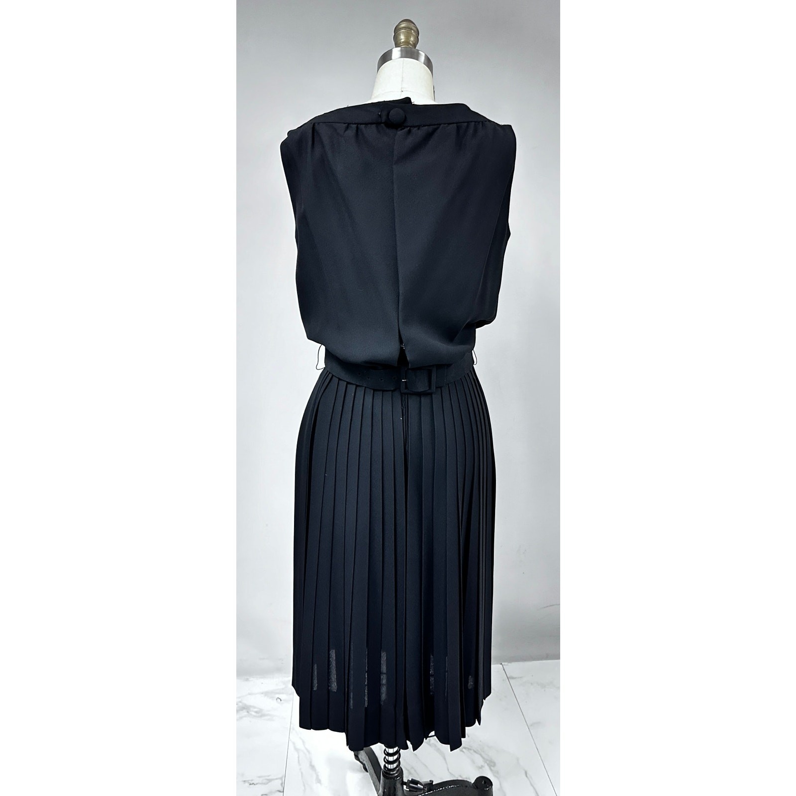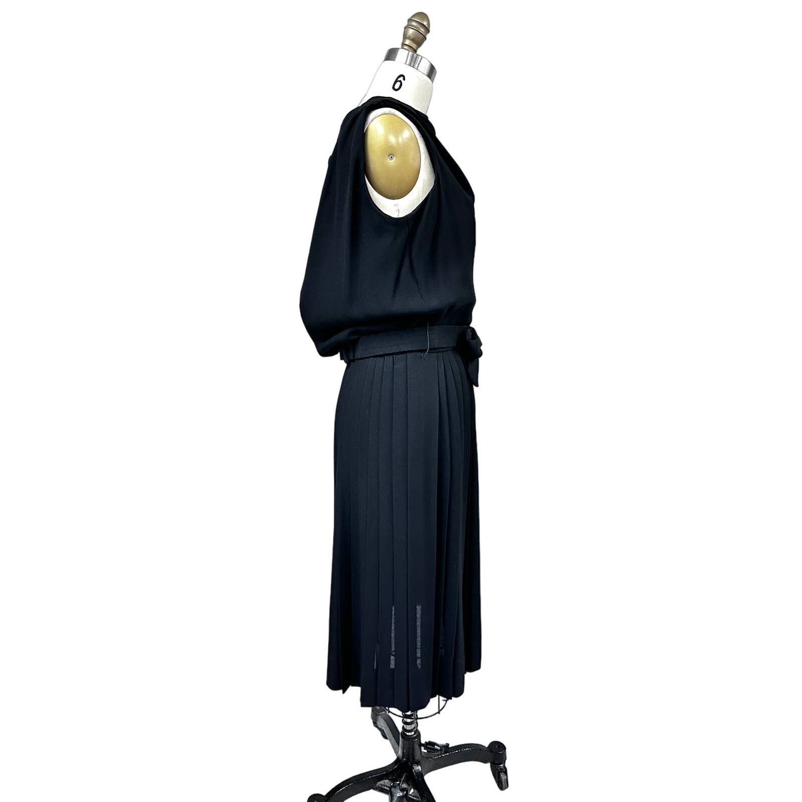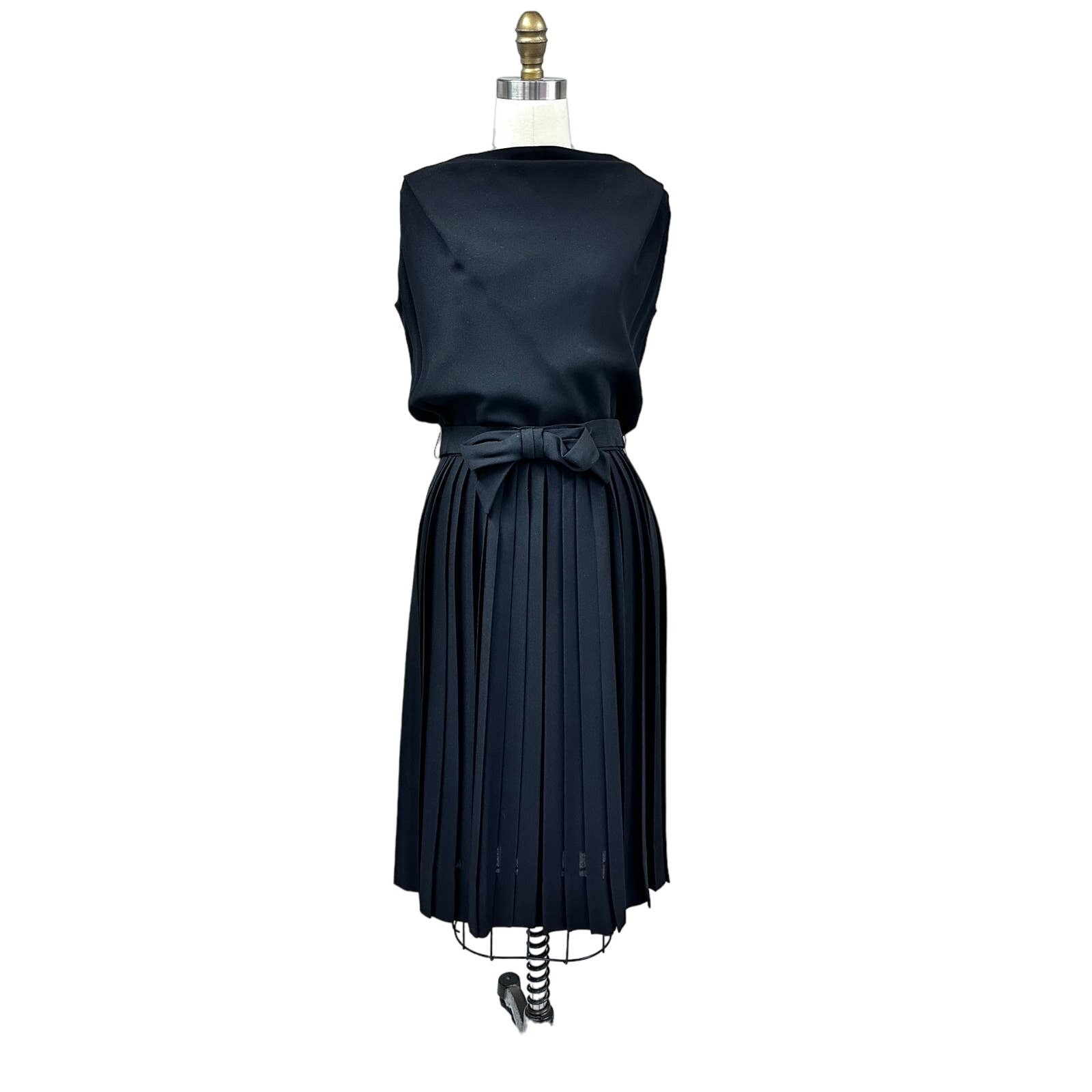 Rayon crepe with semi-sheer pleated skirt, matching belt, metal zipper, hook-and-eye closures.