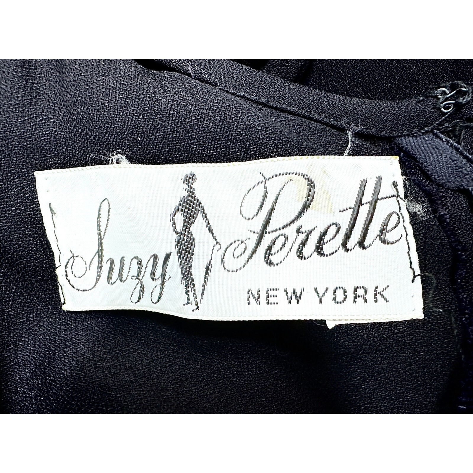 Sophisticated vintage 1950s Suzy Perette dress in black rayon crepe, featuring timeless couture-inspired design details: