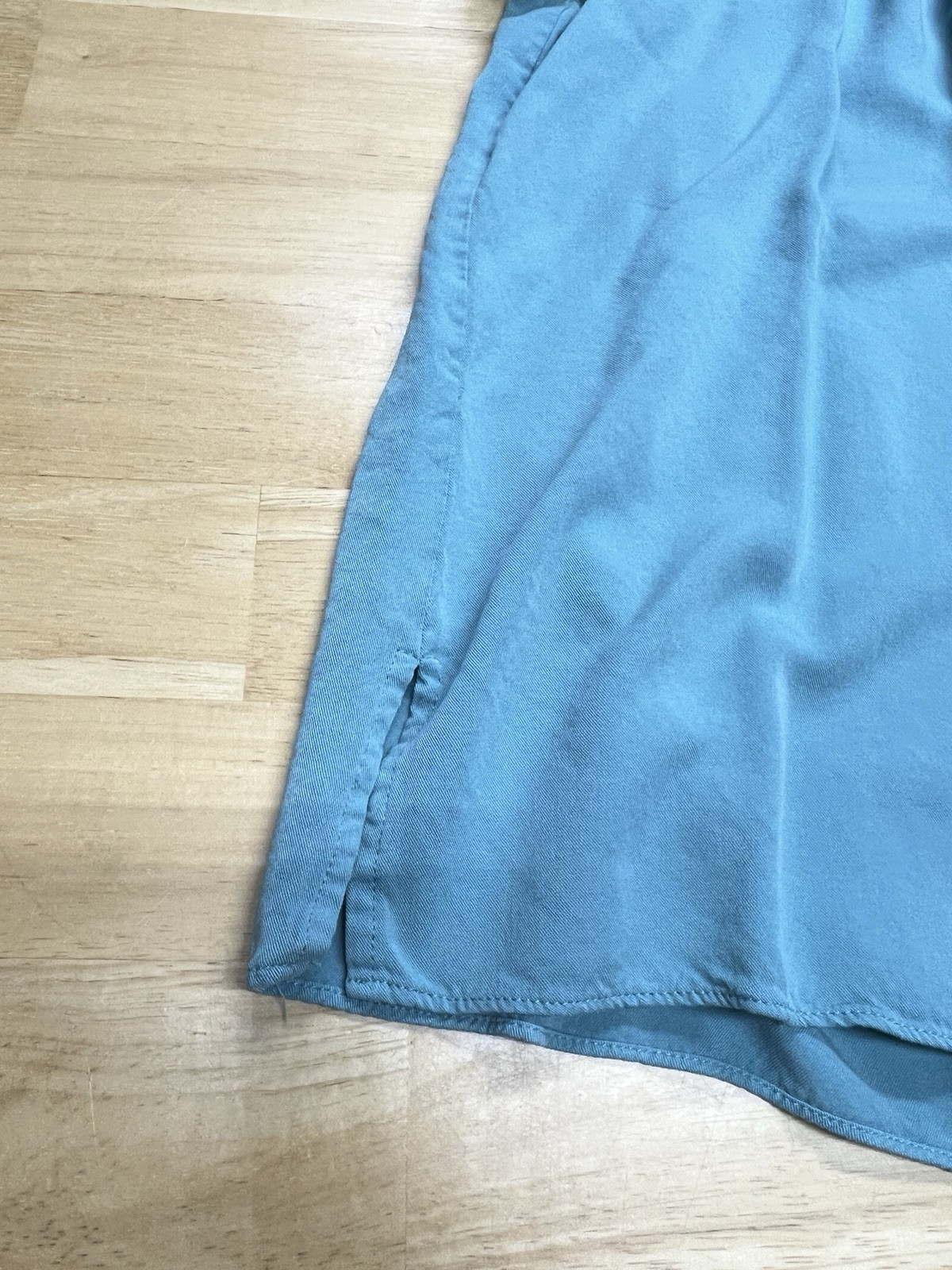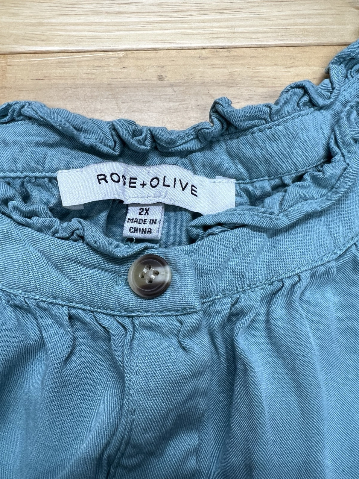 Rose + Olive button-front blouse in a sage green shade (appears more sage than blue). Features flutter sleeves, ruffled neckline, and a relaxed, flowy fit. Made of soft, lightweight fabric.