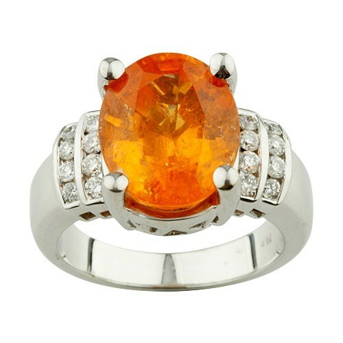 Con un granato spessartito incorniciato da diamanti, supportato da spalle larghe sette millimetri che si assottigliano a una fascia larga tre e mezzo millimetro.