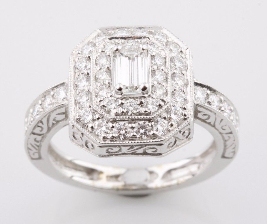 Bellissimo anello diamantato taglio smeraldo in oro bianco da 18k con accenti dimensioni 6 TDW = 1,17 CT