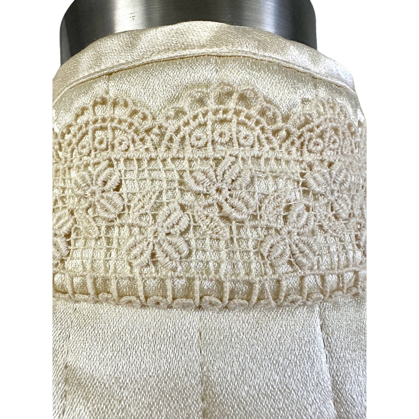 Cream quilted satin (poly/rayon blend). Lace trim. Open-front construction.