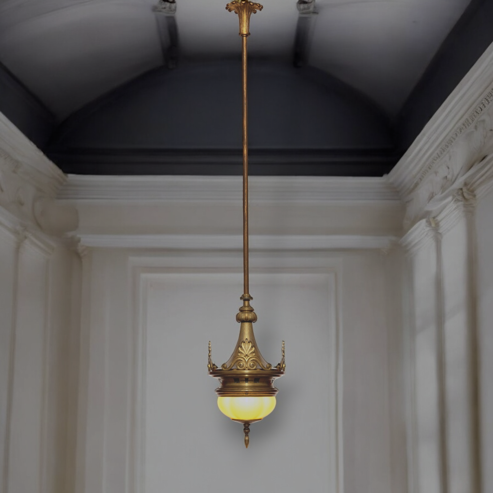 Experience the charm of the past with this original Art Nouveau ceiling lamp, a real hall lantern from 1900 - 1910. This exclusive lamp from the house Lightartshop impresses with its impressive length of 145 cm and fits into every room with a high ceiling as a stylish highlight. Ancient brass finish gives it an unmistakable shine, while the abstract Rocalies pattern and the design make the lantern an artful statement piece. The lantern is suitable for an E14 light bulb and has an energy efficiency class A, which makes it a sustainable lighting option.