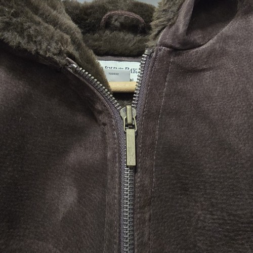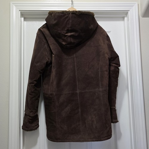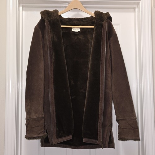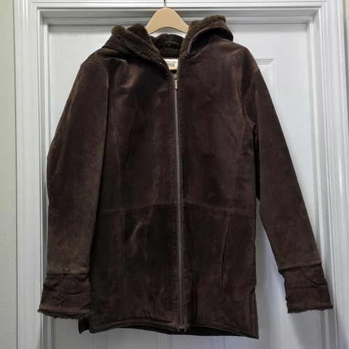 Excellent Condition St. Johns Bay Dark Brown Suede Leather Shearling Lined Hooded Jacket - Women's Tag Size S. Actual measurements: 42" chest, 30.5" length. Fits like a Medium.