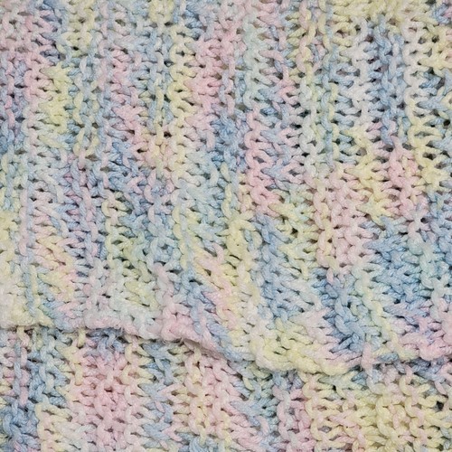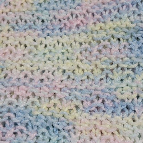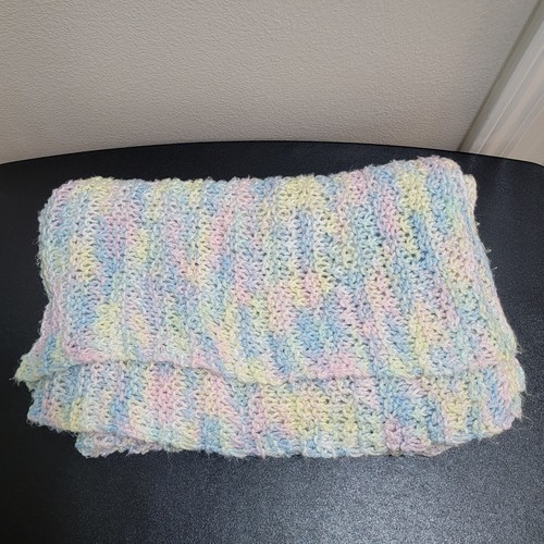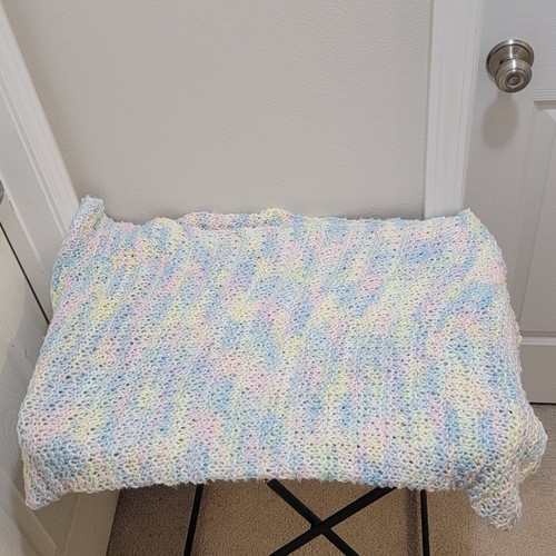 Nice pre-owned Condition Vintage Handmade Lightweight Crochet Knit Baby Afghan Crib Blanket - Soft Pastel Colors: Pink / Yellow / Blue / Green. Approximately 46" x 37"