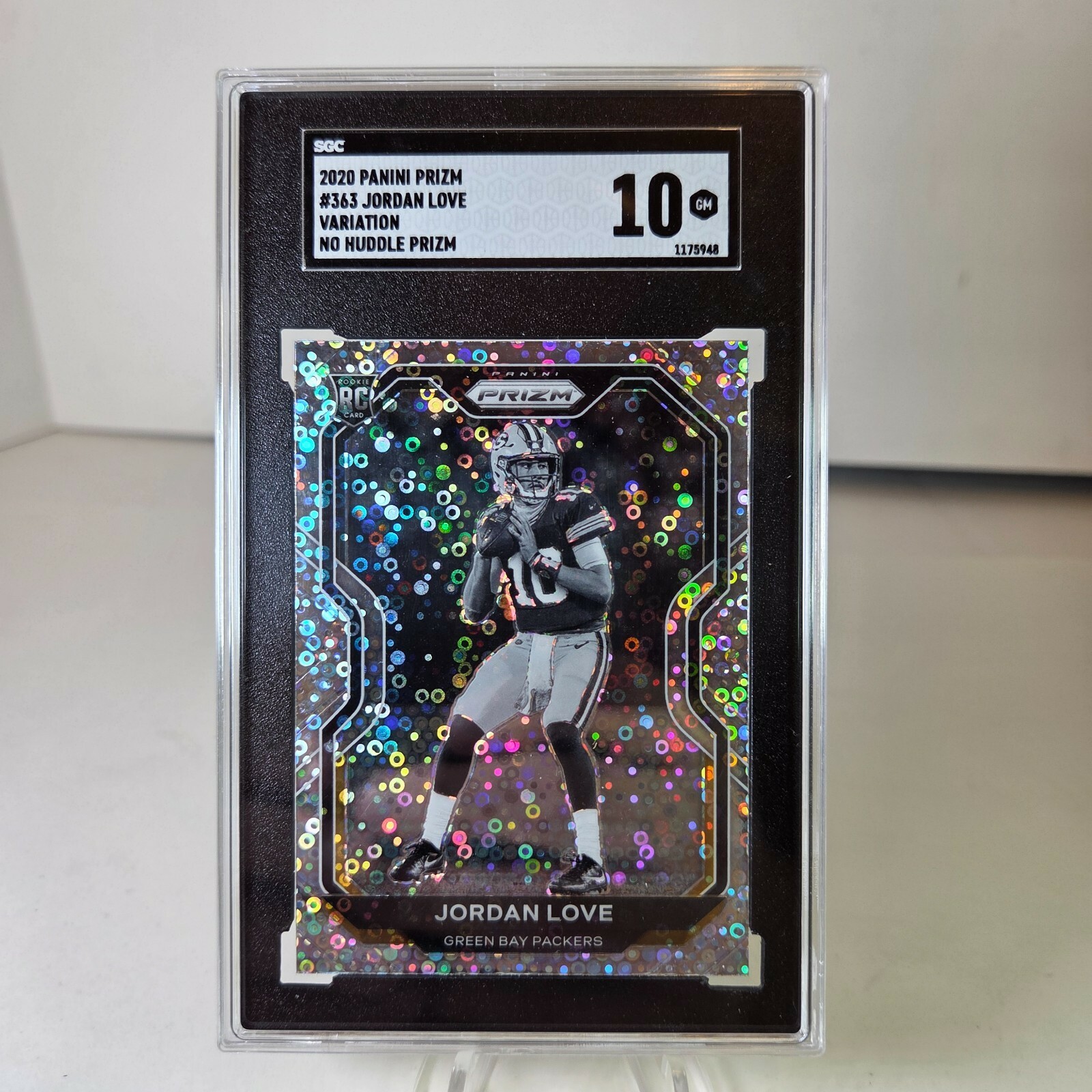 The product is a 2020 Panini Prizm Jordan Love Variation trading card featuring the Green Bay Packers quarterback. This particular card is a No Huddle parallel, identified by the card number #363. Manufactured by Panini, this card is part of the 2020 season collection for the National Football League (NFL). With SGC 10 grading indicating high quality and authenticity, this card appeals to football card collectors looking for a unique and valuable addition to their collection.