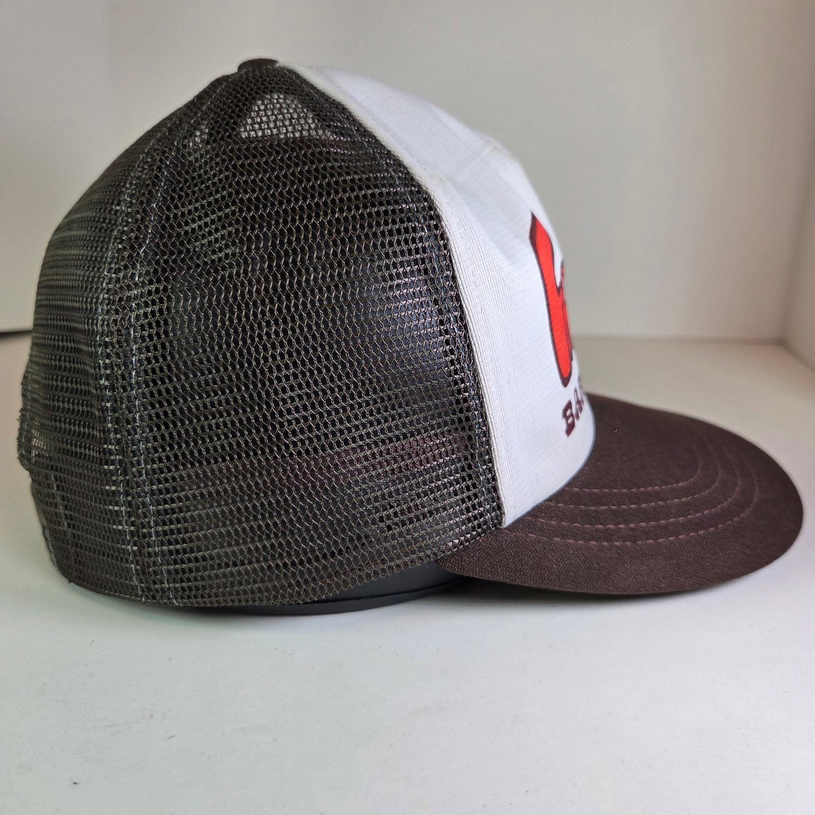 Color: White front, brown mesh brim, orange/red logo