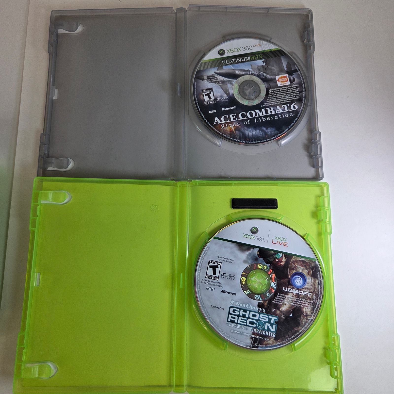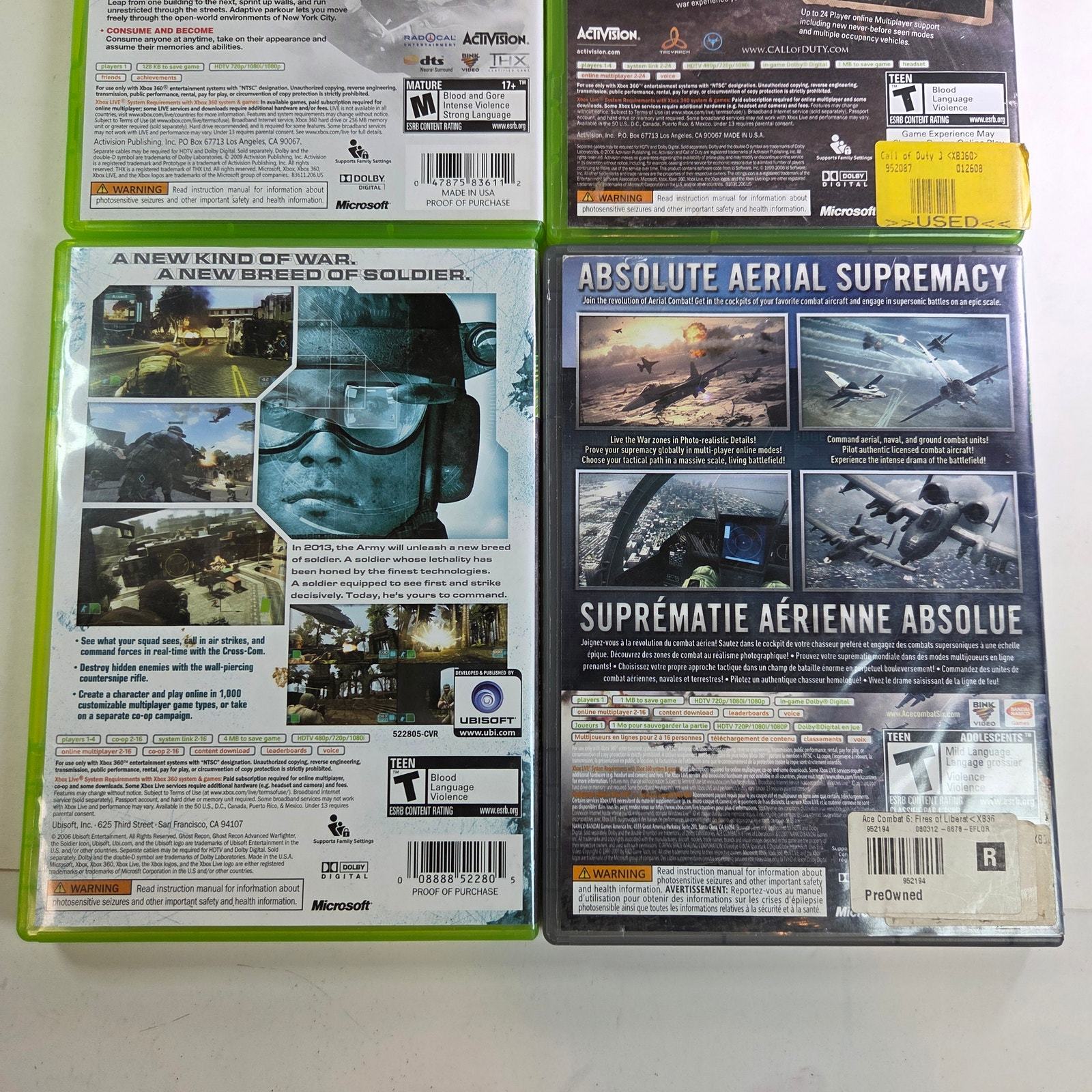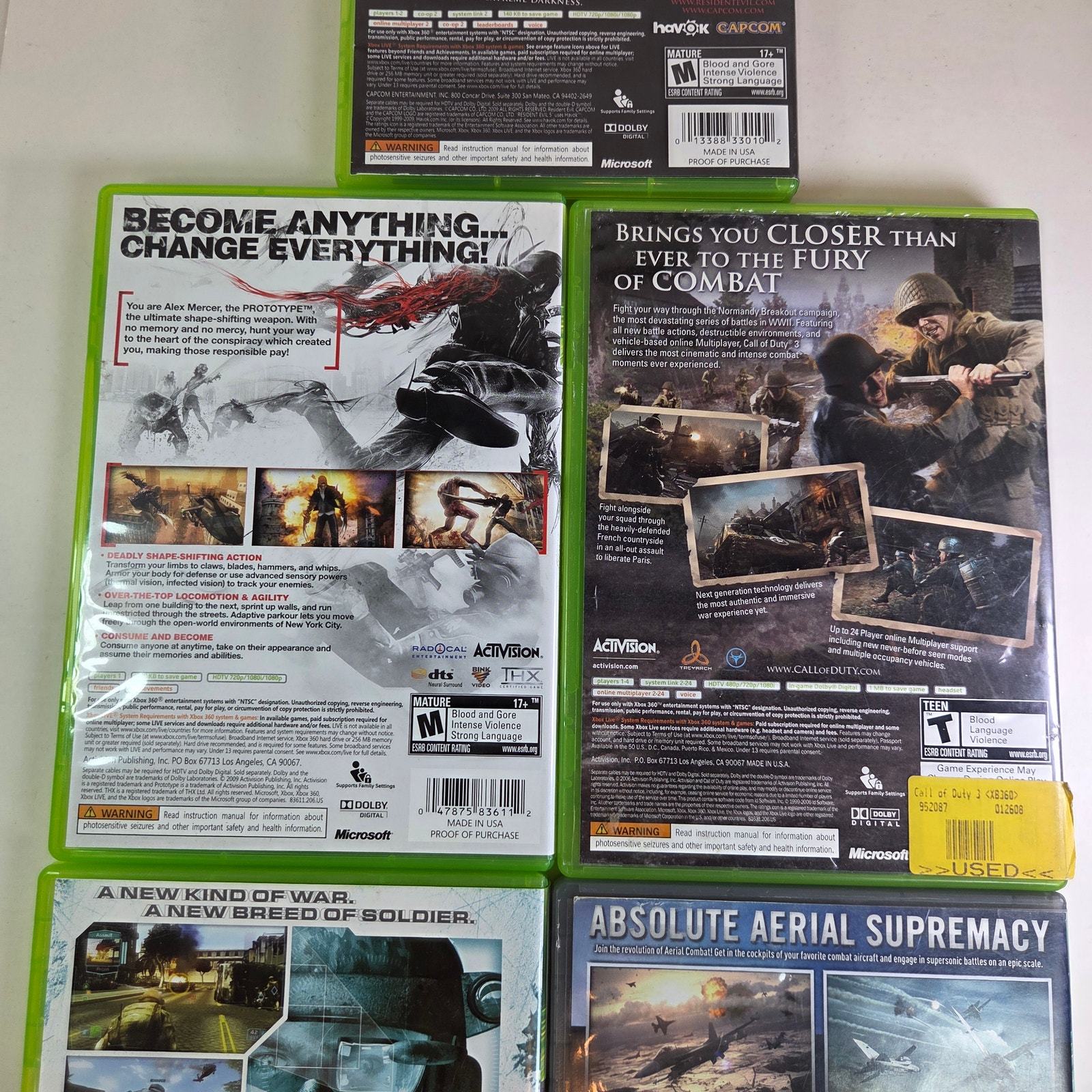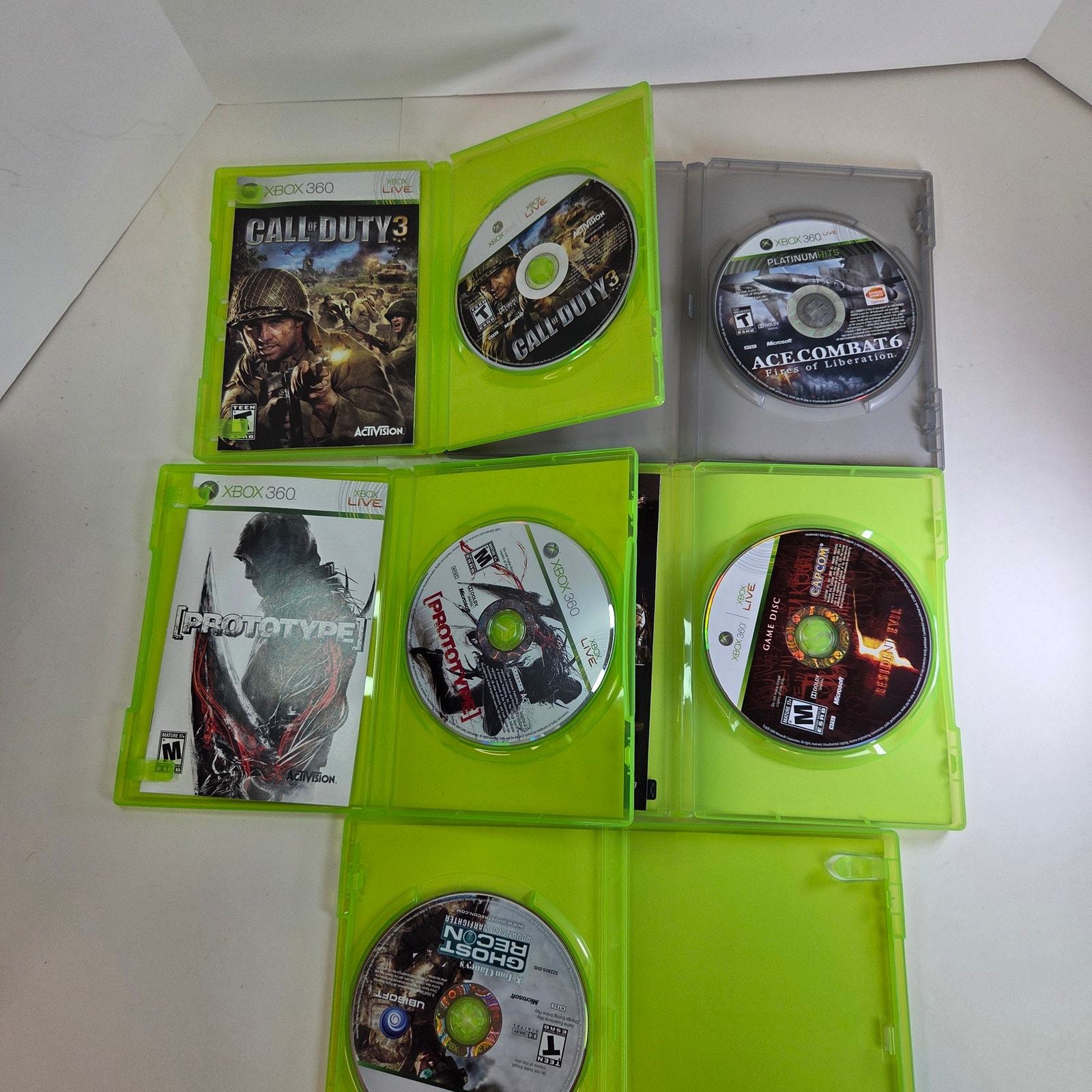 Lot of five Xbox 360 games featuring a mix of action, shooting, and adventure titles. Includes Resident Evil 5, Prototype, Call of Duty 3, Ace Combat 6: Fires of Liberation (Platinum Hits), and Tom Clancy?s Ghost Recon: Advanced Warfighter.