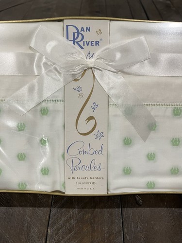 This vintage Dan River pillowcase set features a beautiful green tulip pattern that is perfect for adding a touch of 1950s style to your bedding collection. The pillowcases are made from 100% cotton and have an embroidered design for added texture and detail. The set includes standard size pillowcases and is new and sealed, making it a great addition to any collection of bed and bath linens.