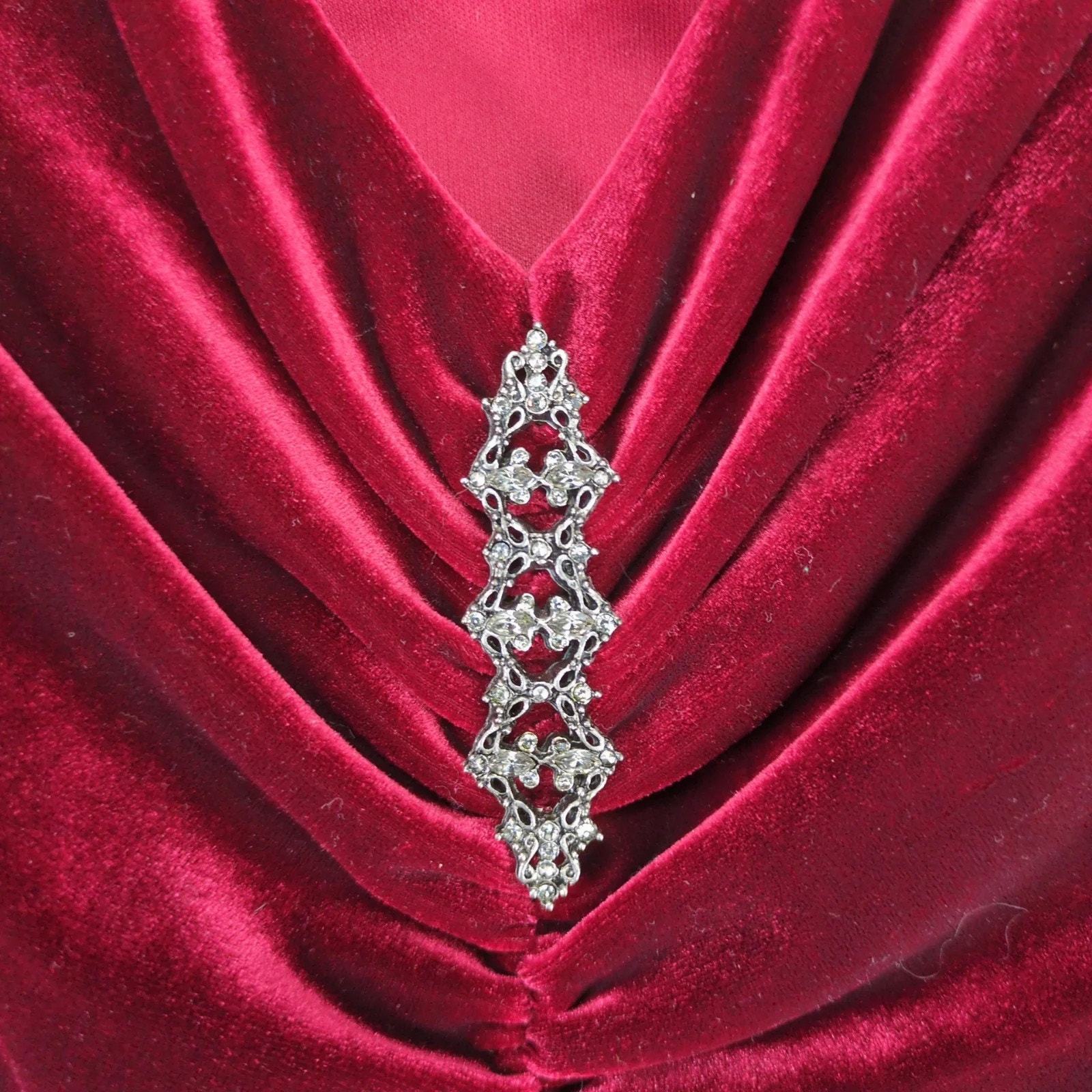 Vtg Liz Claiborne Red Velvet Dress Sz 12 Ruched Sleeveless Rhinestone Brooch