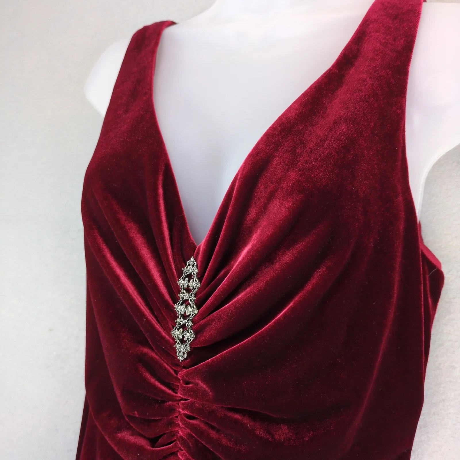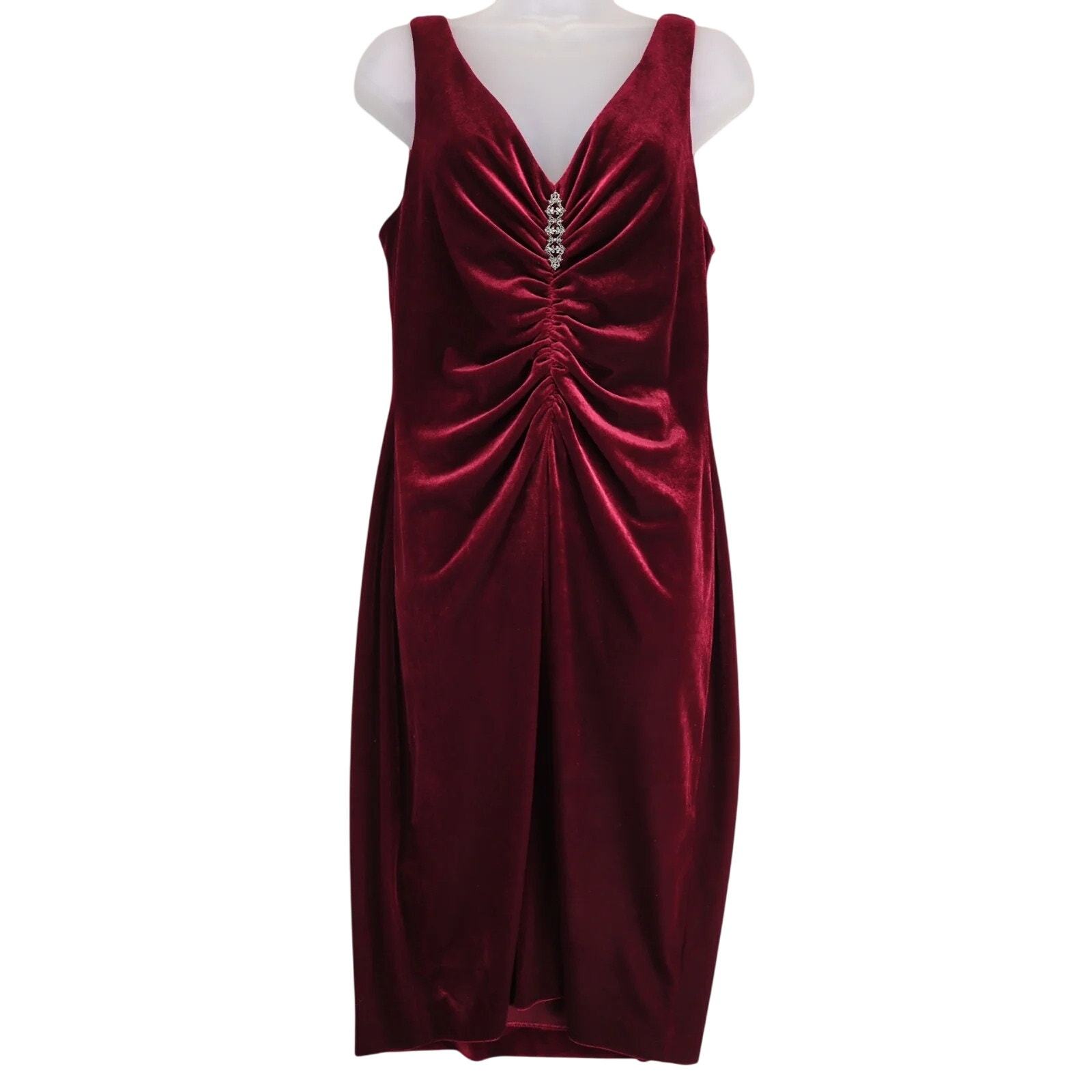 Vtg Liz Claiborne Red Velvet Dress Sz 12 Ruched Sleeveless Rhinestone Brooch 90s
