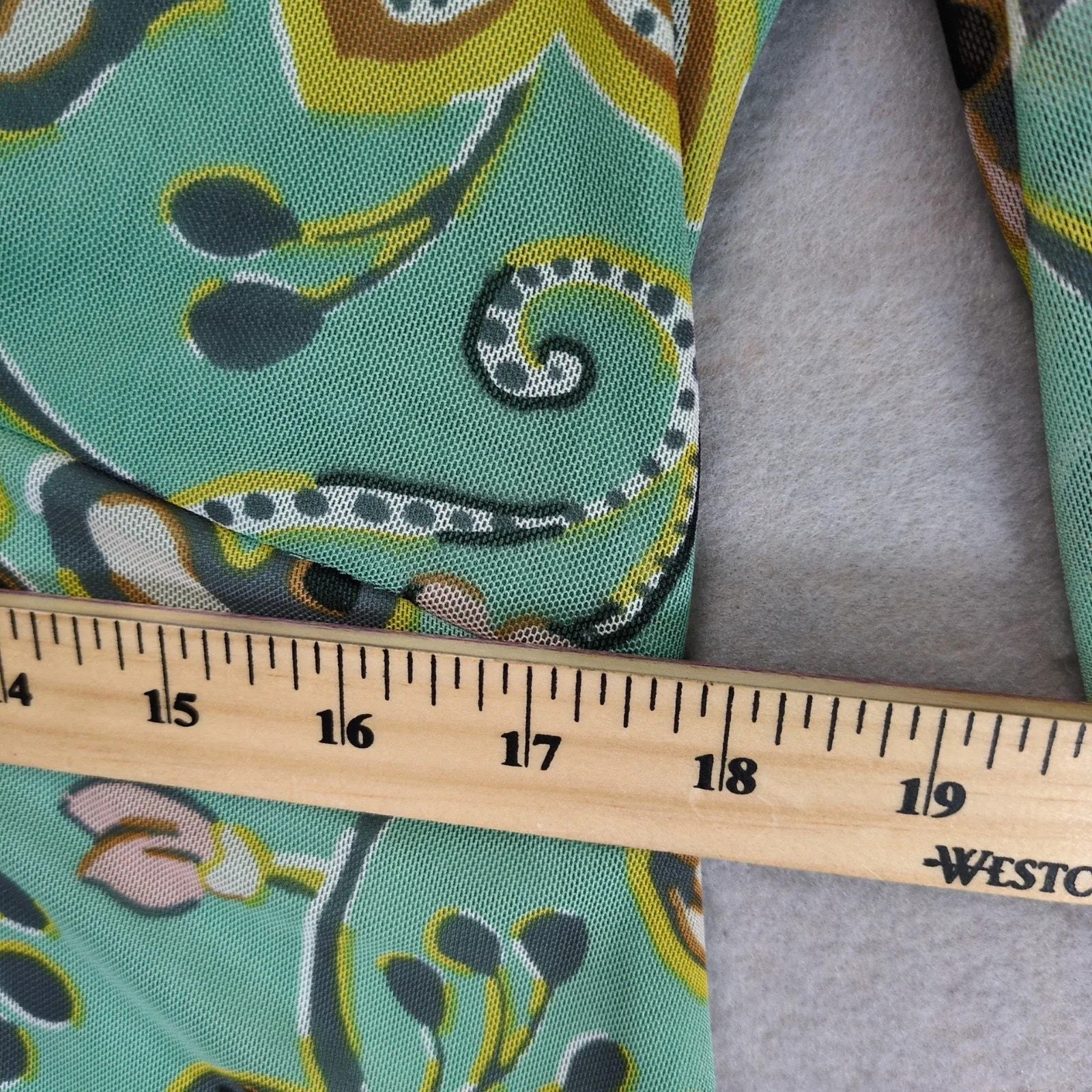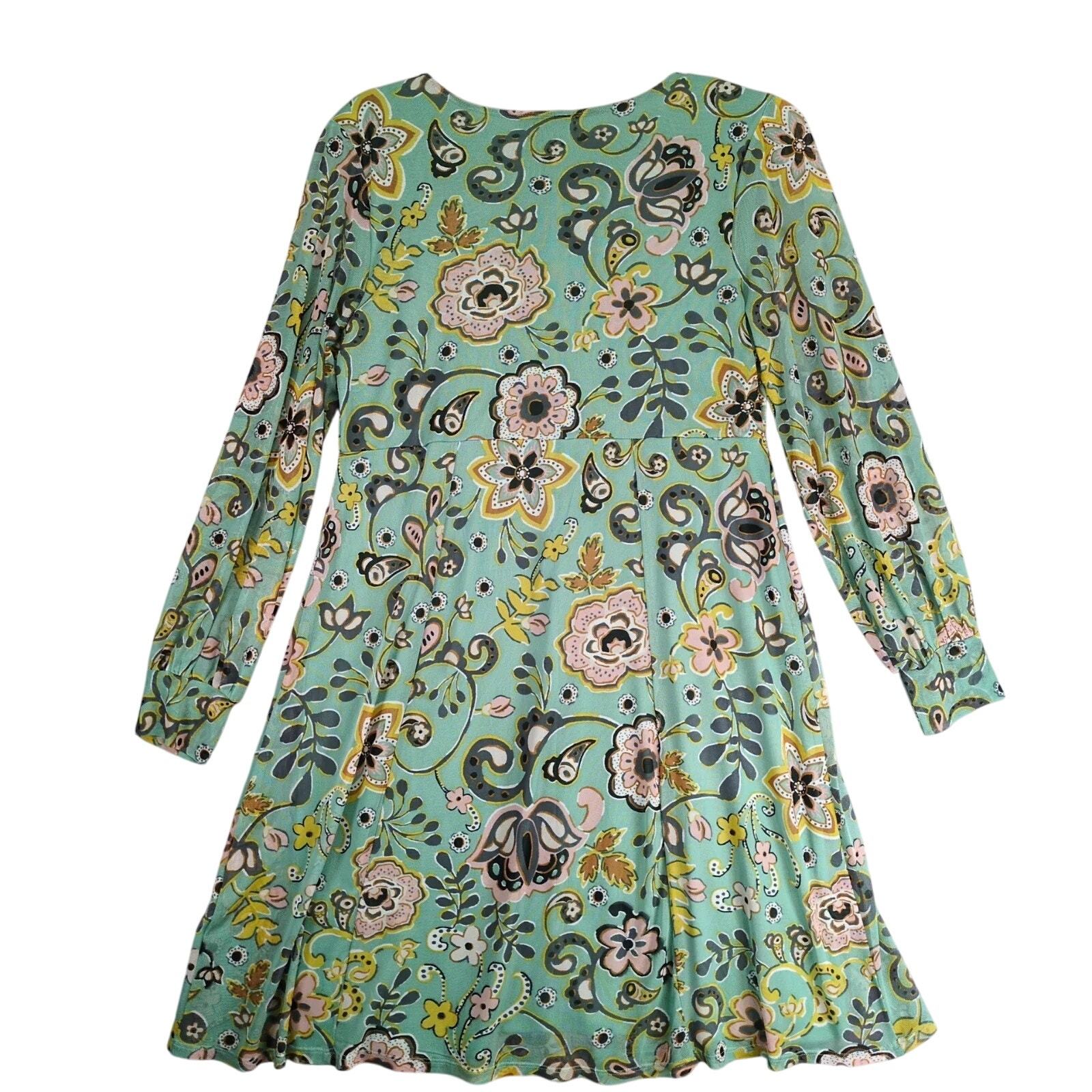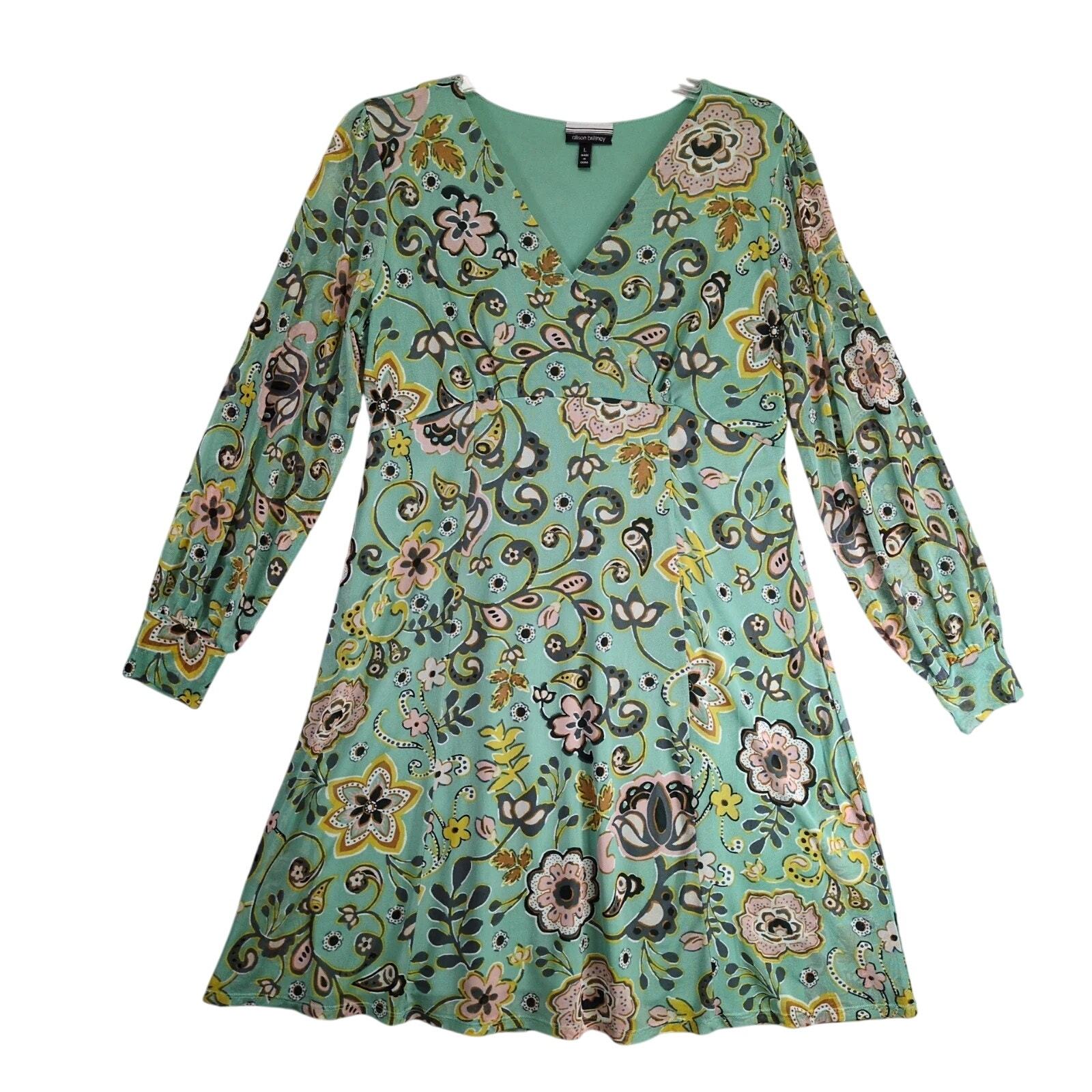 Allison Brittney Green Floral Paisley Dress Sz L Sheer Overlay Wrap-V Neckline