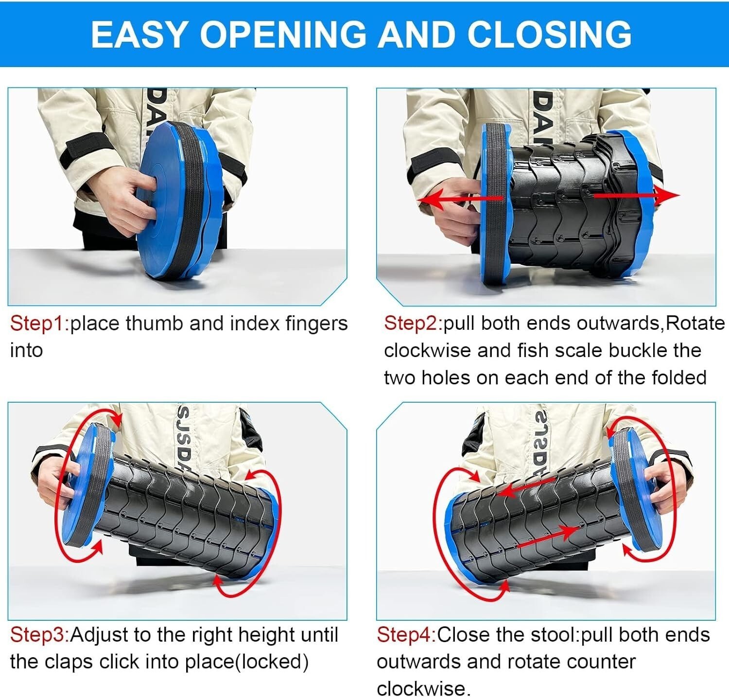 UNIQUE DESIGN: There are two buckles on the top and bottom of the portable telescoping stool. You can also hold the two buckles to stretch them and turn them clockwise / counterclockwise, making them easy to open and close.