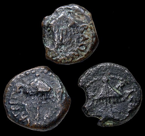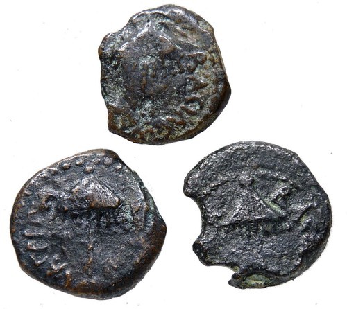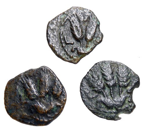 Bronze Prutah Coin, Jerusalem mint, 1.38g, 2.22g 2.56g, 16mm at widest. This is a small coin~compare a U.S. dime which is 17.9mm.