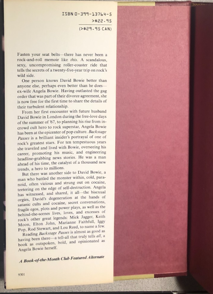 BACKSTAGE PASSES David Bowie by Angela (1993) Putnam illustrated hardcover 1st