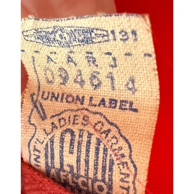 It does have a union label. Full back metal zipper. No stains or other flaws.