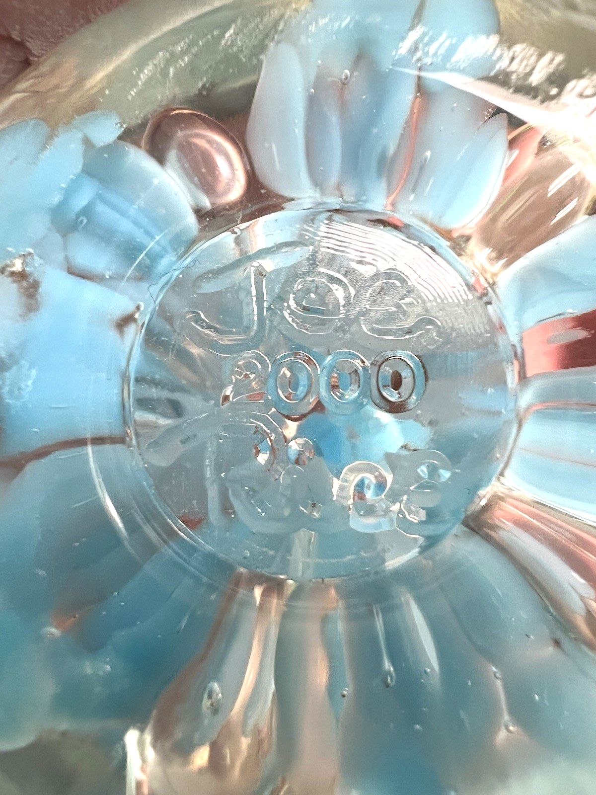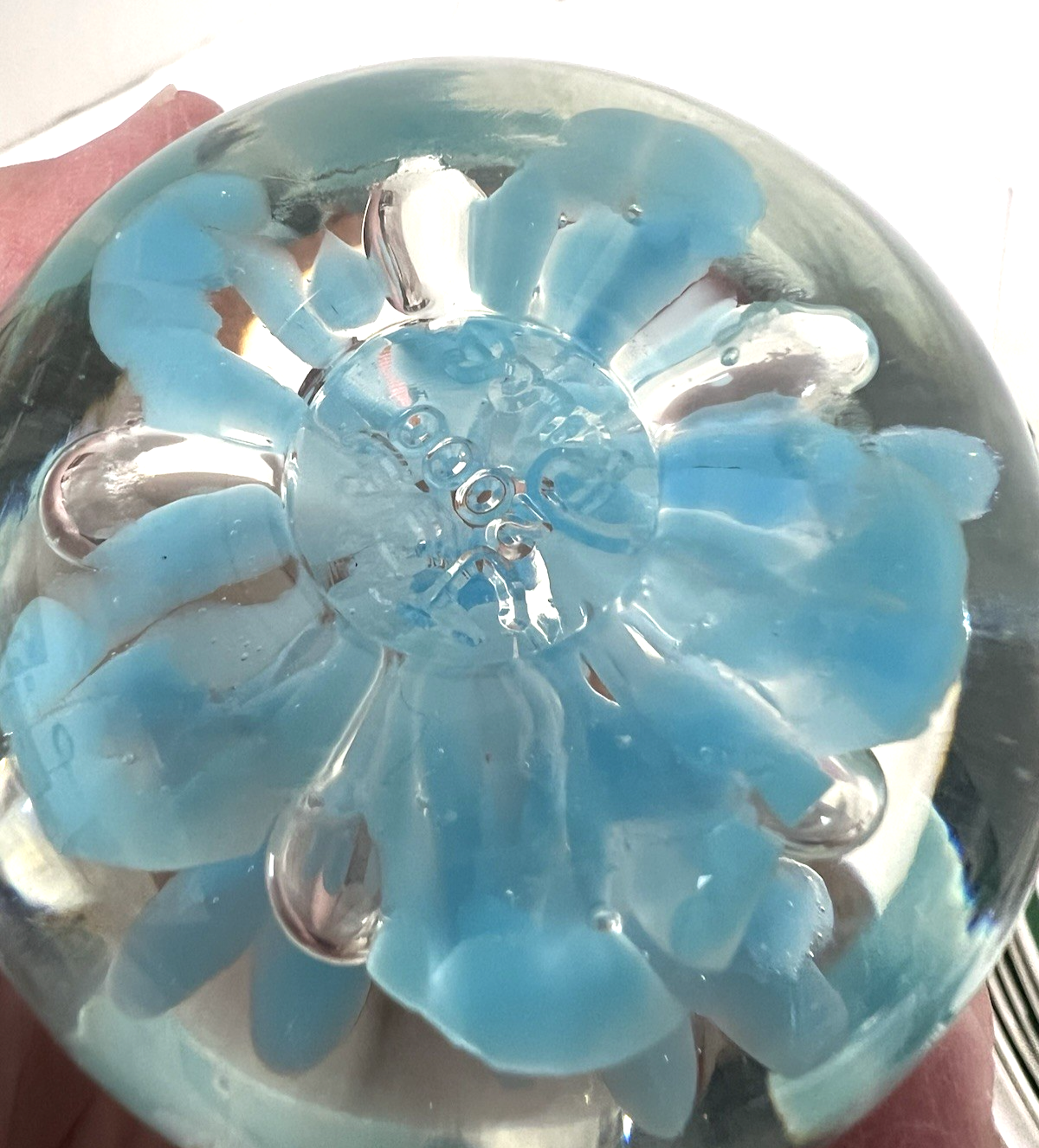 2000 Joe Rice Bright Blue Trumpet Flowers Paperweight Controlled Bubbles Glass about 2 5/8 inches
