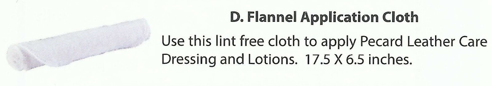 FOR SALE IS ONE (1) NEW PECARD BRAND 17 1/2" x 6 1/2" LINT FREE CLEANING AND BUFFING CLOTH FOR SHOE, BOOTS, HANDBAG, LEATHER GOODS, ETC BY PECARD LEATHER CARE COMPANY. GENUINE PECARD BRAND, PREMIUM QUALITY, SOFT FLANNEL CLOTH OPENS UP TO THE PERFECT SIZE. THIS CLOTH IS USED BEFORE TO CLEAN, OR, FOLLOWING A SHOE SHINE TO OBTAIN THE ULTIMATE SHINE. ONE (1) SOFT FLANNEL CLOTH WILL BUFF YOUR SHOES OR BOOTS TO A BRILIANT SHINE AFTER POLISHING. DURABLE CLOTH EFFICIENTLY BUFFS THE ARTICLE SURFACE. ALSO GREAT FOR FAST TOUCH UPS BETWEEN POLISHES. GREAT FOR THE GLOVE BOX, DESK DRAWER, PURSE OR TRAVEL BAG. PREMIUM PECARD QUALITY, THIS GENUINE PECARD BRAND SHINE CLOTH IS THE GOLD BAR STANDARD FOR ACHIEVING THE SUPER SHINE AFTER POLISHING BOOTS, SHOES OR LEATHER ARTICLES. A QUALITY SHINE CLOTH IS A REQUIRED TOOL FOR ANY GROWN ADULT. YOU WILL RECEIVE ONE (1) NEW SOFT FLANNEL SHINE CLOTHS BY PECARD BRAND, SHIPPED BY USPS FIRST CLASS MAIL....