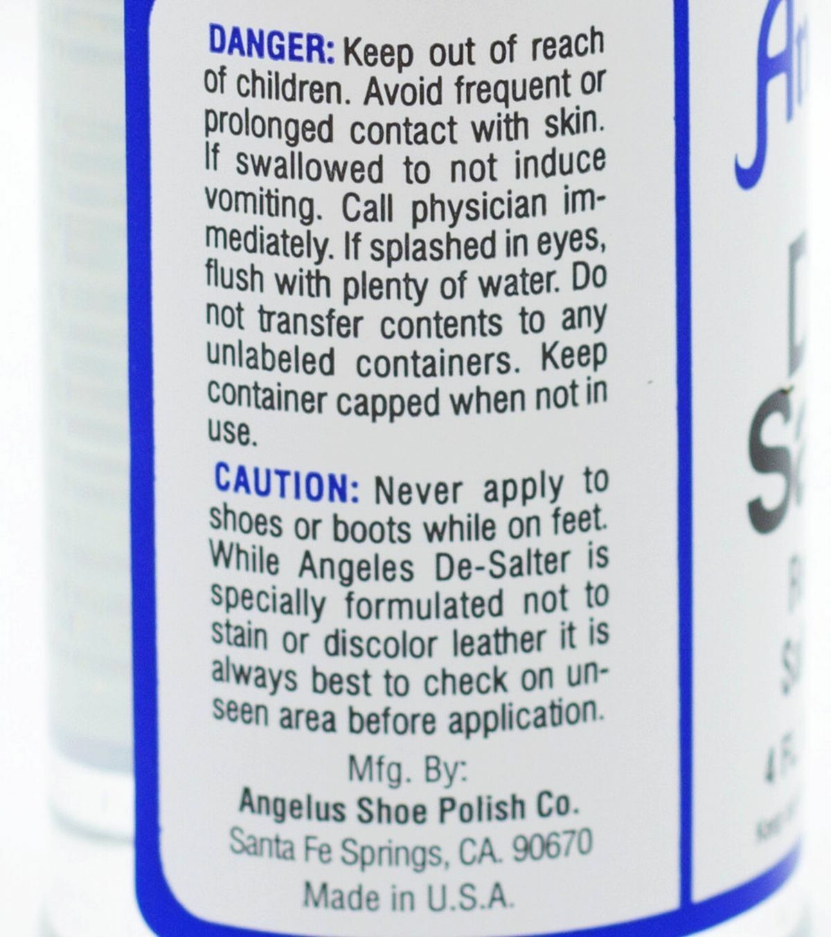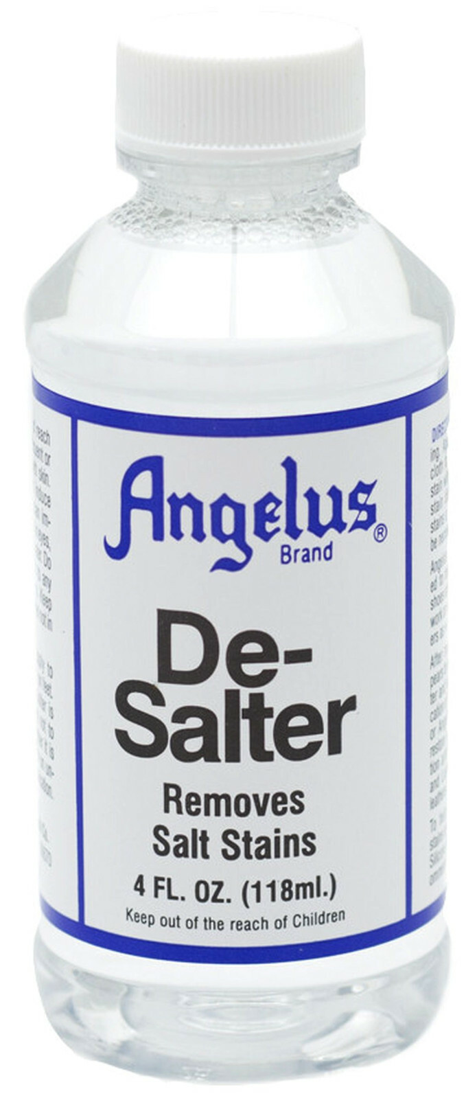 FOR SALE IS ONE (1) NEW BOTTLE OF ANGELUS BRAND DE-SALTER WATER AND SALT STAIN REMOVER 4 fluid ounce BOTTLE MANUFACTURED BY ANGELUS SHOE POLISH COMPANY MPN 853. ANGELUS BRAND LIQUID De-Salter IS FORMULATED TO REMOVE SALT STAINS (white staining) CAUSED BY RAIN, SNOW, ICE, SALT, EVEN PERSPIRATION FROM SHOES, BOOTS, CANVAS, CLOTHES, CAR SEATS, ETC. ANGELUS DE-SALTER WILL WORK ON SUEDE AND NAPPY LEATHERS AND SMOOTH LEATHERS TOO. WHITE HAZE OR WHITE POWDER ON YOUR LEATHER MEANS YOU HAVE EXPOSED THE LEATHER TO THE DESTRUCTIVE EFFECTS OF SALT. SALT WILL TURN YOUR LEATHER TO JERKY. USE ANGELUS DE-SALTER SHORTLY AFTER EXPOSURE TO SALT FOR VERY BEST RESULTS. ANGELUS QUALITY, USA MADE IN SANTE FE SPRINGS, CALIFORNIA. ANGELUS LEATHER CARE PRODUCT HAVE BEEN USED BY LEATHER CARE PROFESSIONALS FOR OVER ONE HUNDRED YEARS (since 1907) ON SADDLES, BOOTS, SHOES, LUGGAGE, UPHOLSTERY, ETC. YOU WILL RECEIVE ONE (1) BOTTLE OF ANGELUS DE-SALTER FLUID SHIPPED BY USPS FIRST CLASS MAIL.....
