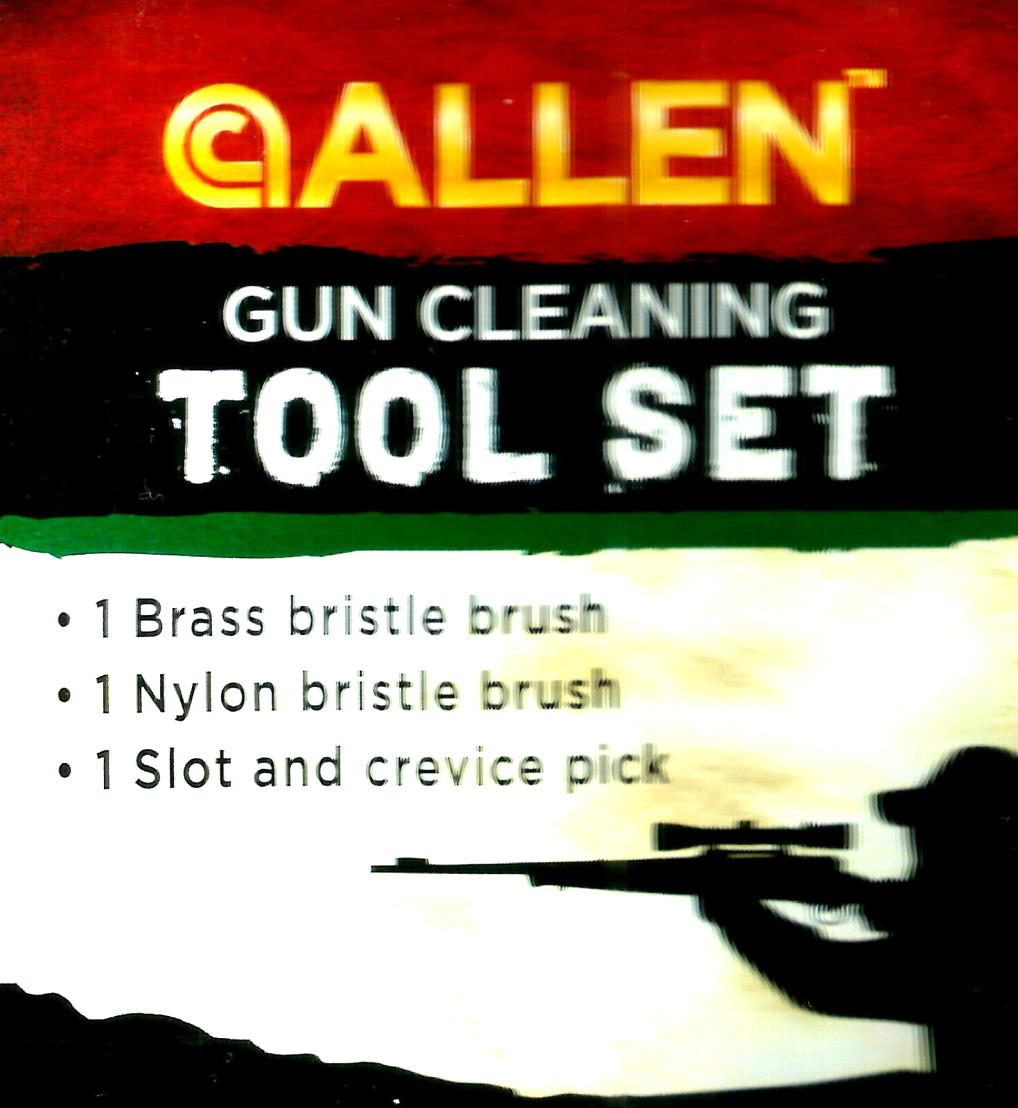 FOR SALE IS ONE (1) NEW GUN CLEANING THREE (3) PIECE TOOL SET WITH BRASS BRUSH, NYLON BRUSH AND SLOT CREAVICE PICK BY ALLEN BRAND MPN 706A UPC# 026509007067. HELPS CLEAN HARD TO REACH RESIDUE, THREE PIECES INCLUDING ONE BRASS BRISTLE BRUSH, ONE NYLON BRISTLE BRUSH AND ONE SLOT AND CREVICE PICK. MAKES CLEANING YOUR SHOTGUN, RIFLE, HANDGUN, ANY FIREARM EASIER. THIS THREE piece SET FROM ALLEN IS A GREAT WAY TO GET STARTED CLEANING AND MAINTAINING YOUR FIREARM. YOU WILL RECEIVE ONE (1) ALLEN GUN CLEANING TOOL SET SHIPPED BY USPS MAIL.....