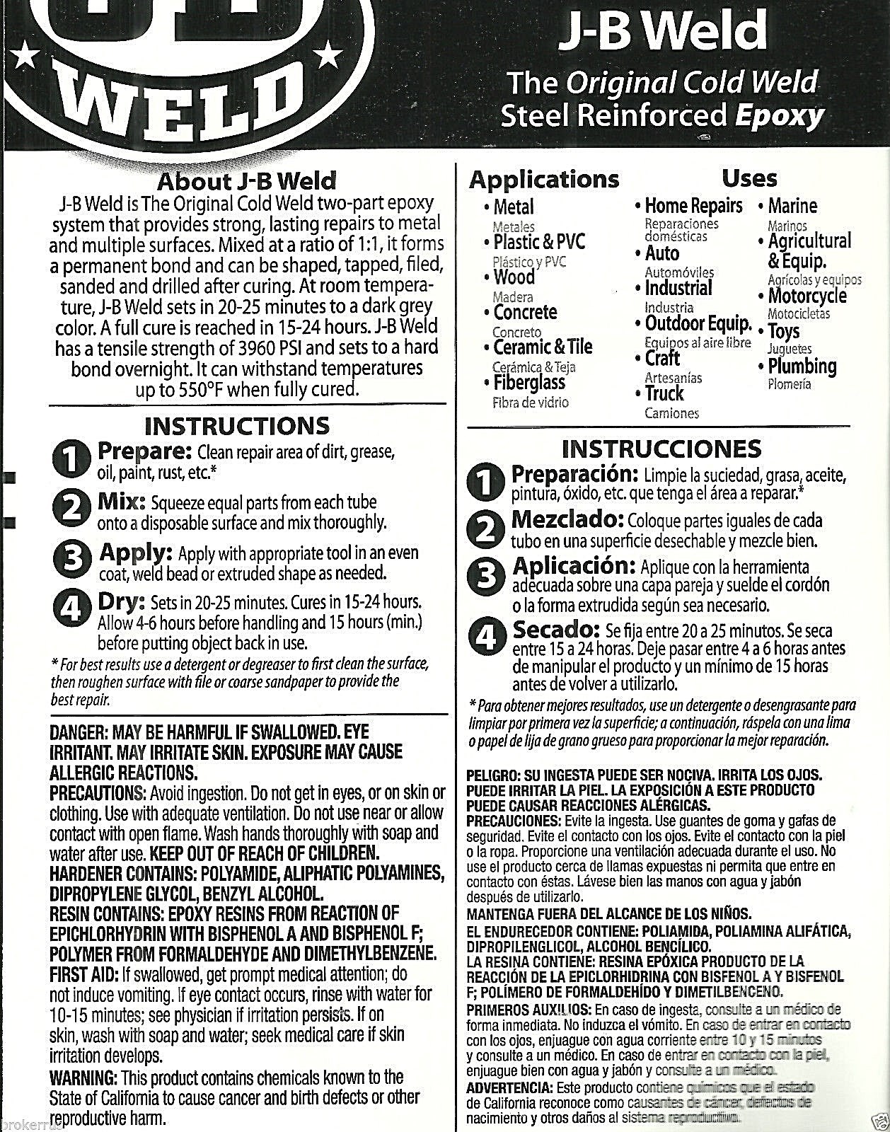 FOR SALE IS ONE (1) NEW PROFESSIONAL SIZE PACKAGE (two 5 ounce tubes) OF THE ORIGINAL J-B WELD COLD WELD TWO PART EPOXY ADHESIVE BY J-B WELD COMPANY MPN 8281 (formerly mpn 8280) UPC# 043425082817. MADE IN USA, EACH PACKAGE CONTAINS TWO BIG INDUSTRIAL SHOP SIZE TUBES, EACH TUBE CONTAINS 5 ounces OF J-B WELD ORIGINAL, CLASSIC AND ORIGINAL FORMULATION (standard packaging of this formula contains two 1 ounce tubes). THESE TWO (2) LARGE TUBES WERE FORMERLY AVAILABLE IN A BOX AS THE PRODUCT NUMBER 8280, NOW REPACKAGED IN CLAMSHELL AS PRODUCT NUMBER 8281, SAME CONTENTS AND SAME SIZE TUBES, JUST REVISED EXTERIOR PACKAGING. THIS LARGE SIZE IS FOR MAKING PERMANENT REPAIRS OF LARGER ITEMS or JUST MAKING LOTS OF REPAIRS. MIX EQUAL AMOUNTS FROM EACH TUBE. THIS IS THE CLASSIC, ORIGINAL AND FLAGSHIP PRODUCT OF J-B WELD COMPANY. THE WORLD'S FINEST COLD WELD COMPOUND. EASY, AN INEXPENSIVE ALTERNATIVE TO WELDING, SOLDERING AND BRAZING. WORKS WITH ANY POROUS OR NON-POROUS MATERIAL LIKE IRON, STEEL, ALUMINUM, BRASS, BRONZE, COPPER, PEWTER, WOOD, PORCELAIN, CERAMIC AND MUCH MORE. DRILL IT, GRIND IT, EASY TO USE 2 PART FORMULA. THOROUGHLY MIX EQUAL PARTS FROM EACH TUBE AND THEN APPLY. J-B WELD MAXIMUM TEMPERATURE IS 600 DEGREES FAHRENHEIT, TENSILE STRENGTH IS 3960 PSI, CURE TIME 15-24 HOURS, CURE COLOR DARK GREY, DOES NOT CONDUCT ELECTRICITY, 15 HOUR FULL CURE TIME, 24 HOURS FOR PREMIUM RESULTS. HANDS DOWN, THIS IS MY FAVORITE ADHESIVE IN THE WORLD AND I SWEAR BY IT. SEE THE PICTURES TO VIEW THE COLOR AFTER MIXING AND CURING (dark gray color). YOU WILL RECEIVE ONE (1) PROFESSIONAL SIZE PACKAGE (two 5-ounce tubes) OF JB WELD ORIGINAL COLD WELD FORMULA SHIPPED BY USPS.....