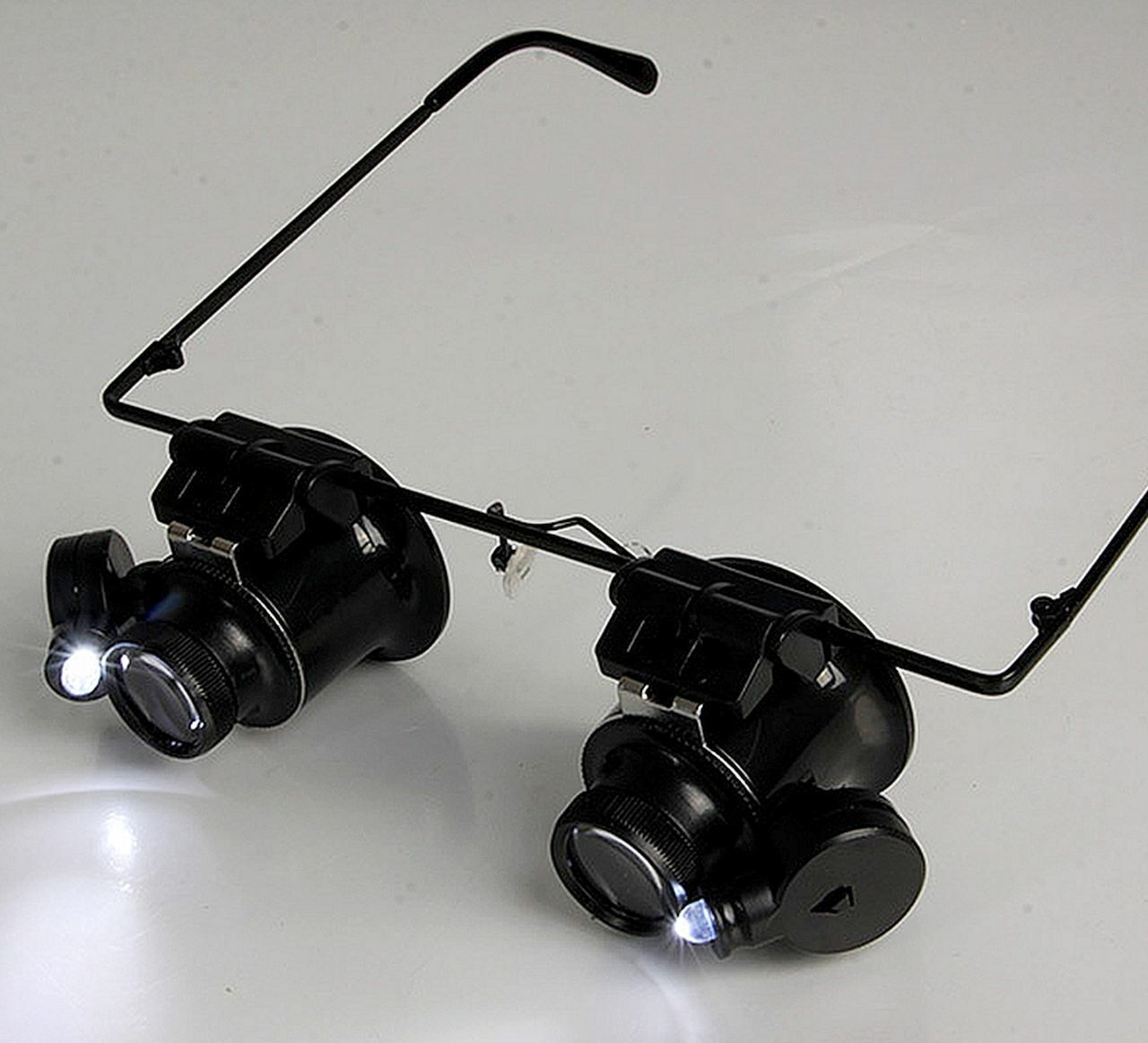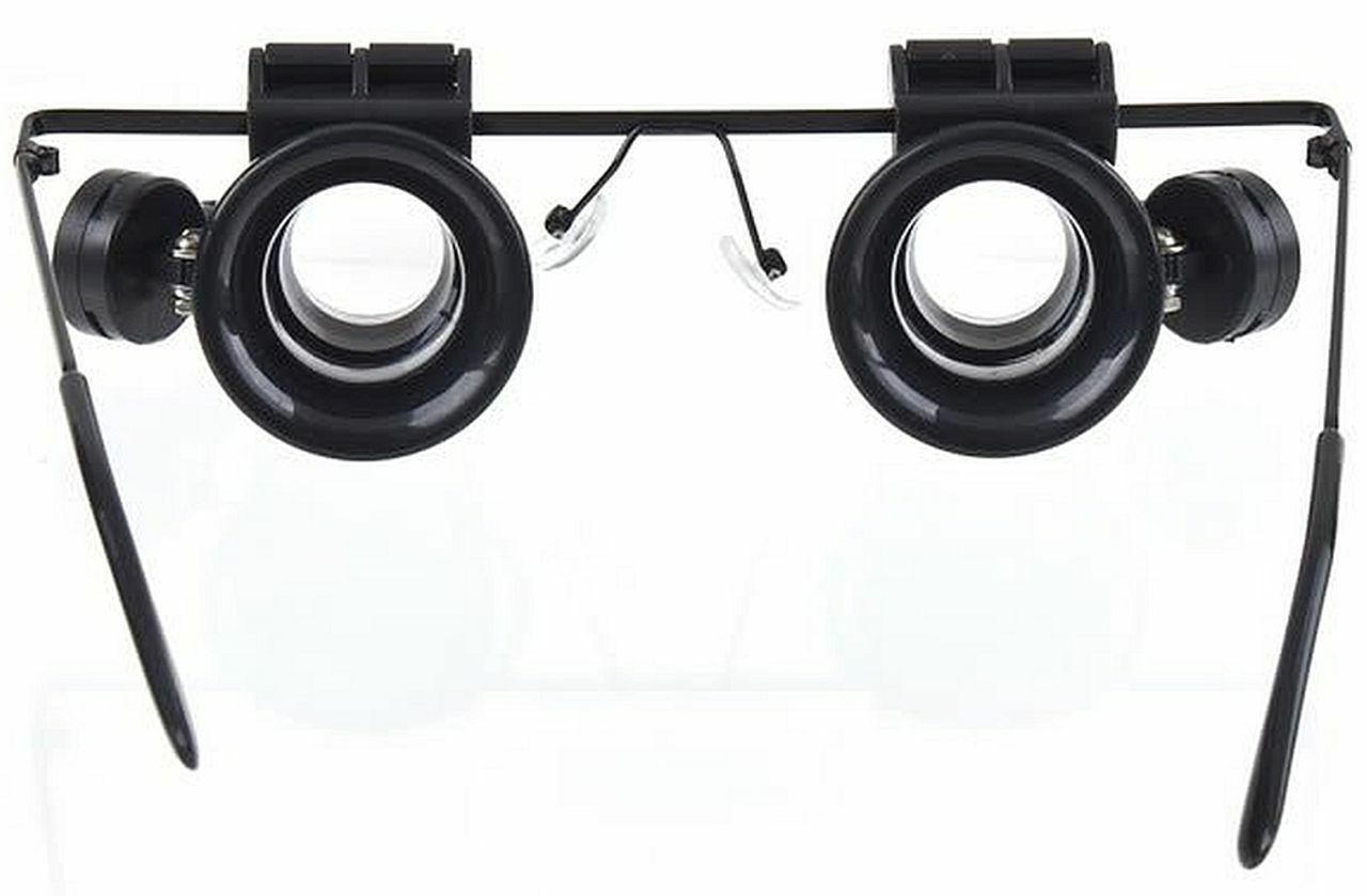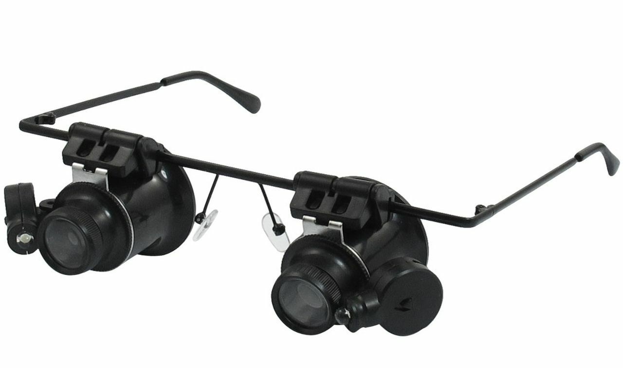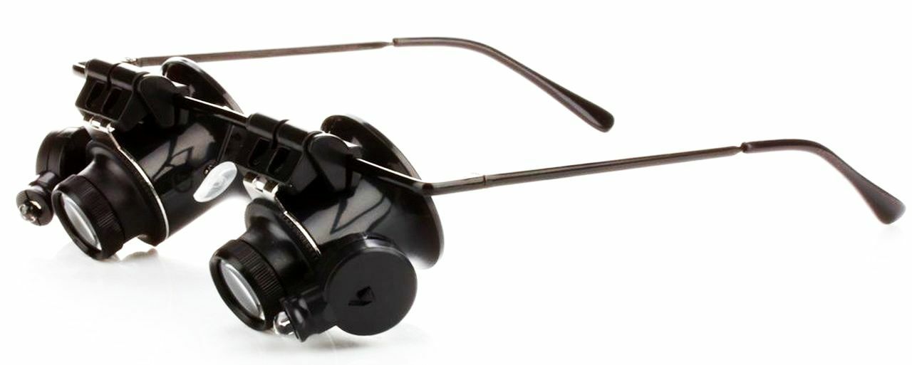FOR SALE IS ONE (1) NEW DUAL LENS (left and right) 20X (20x = 20 power) MAGNIFYING GLASSES WITH LED LIGHTS AND BATTERIES MPN 9892A-ii UPC# 792363388962. THESE MAGNIFYING GLASSES ARE HIGHer POWER (20X) WITH A small VERY MAGNIFIED AND small FIELD OF VIEW, USED FOR VERRRRY CLOSE UP HANDS FREE VIEWING. NOT FOR READING OR GENERAL USE, MORE FOR REMOVING SPLINTER, EXAMINATION OF MICROSHIP OR DETAILED WORK OR EXAMINATION OF VERY SMALL PARTS, OR JEWELRY. USE THESE POWERFUL (20X = 20 power) )MAGNIFYING GLASSES WITH LED LIGHTS WHEN YOU REQUIRE HANDS FREE, LIKE WATCHMAKER OR DETAILED WORK. THIS EYEGLASSES STYLE DUAL MAGNIFIER WITH LED LIGHTS ON EACH SIDE ALLOWS YOU TO FREE YOUR HANDS SO YOU CAN WORK. THESE GLASSES ARE DESIGNED FOR 20X POWERFUL MAGNIFICATION AT A CLOSE DISTANCE, REMOVE A SPLINTER, EXAMINE A STAMP CLOSE UP, VIEW THE DOTS IN NEWSPAPER PRINT. MAGNIFICATION OF 20X (20 power) MAKES THIS A POWERFUL MAGNFIER WITH A LIMITED VIEW FIELD, NOT FOR READING OR GENERAL USE DUE TO THE HIGHer MAGNIFICATION OF 20X (20 power). USE LEFT SIDE, RIGHT SIDE OR BOTH SIDES, DUE TO THE FLIP UP FEATURE. UNIQUE METAL GLASSES FRAME WITH LEFT AND RIGHT FLIP UP LENS DESIGN LETS YOU VIEW ITEM WITH OR WITHOUT 20X (20x = 20 power) MAGNIFICATION, WITH OR WITHOUT LIGHT, EACH LENS FLIPS UP OR FLIPS DOWN INDIVIDUALLY DELIVERING POWERFUL 20X MAGNIFICATION. FITS COMFORTABLY JUST LIKE A PAIR OF GLASSES. ADJUSTABLE AND INDEPENDENT LED LIGHTS ON BOTH SIDES WITH INDEPENDENT SWITCHES FOR MORE CONTROL SINCE LIGHT IS VITAL TO EFFECTIVE MAGNIFICATION. EACH LED LIGHT USES TWO CR-1620 BATTERIES WHICH ARE INCLUDED. THIS DUAL LENS 20 power MAGNIFIER PROVIDES A RATHER HIGH 20X MAGNIFICATION WHICH IS MORE SUITABLE FOR PROJECTS WHERE HIGH MAGNIFICATION IS REQUIRED (great for removing a splinter). THE MOST COMMON MARNIFIERS PROVIDE 10X or 20X (10 or 20 power). THIS MAGNIFIER IS NOT SUITABLE FOR READING, THIS MAGNIFIER IS NOT ADJUSTABLE. WHEN YOU MAGNIFY MORE, YOU SEE LESS OF THE VIEWING AREA, WHICH IS THE CASE HERE (increased magnification = decreased viewing area). THESE ARE NOT SUITABLE FOR READING, WHERE YOU MAY DESIRE 2, 3 or 5 POWER MAGNIFICATION, THESE SPECIALTY GLASSES ARE DESIGNED FOR AN very CLOSE UP VIEW. JUST LIKE A HIGHER POWER JEWELERS LOUPE, HIGH MAGNIFICATION REQUIRES THE MAGNIFIED ITEM BE HELD VERY CLOSE TO LENS AREA(S). GREAT FOR WORKING ON WATCH, CLOCK REPAIR, PRECISION INSTRUMENTATION, ELECTRONICS, JEWELRY, COINS, STAMPS, SMALL PARTS, ELECTRONICS. THIS MAGNIFIER ALLOWS YOU TO REMOVE A SPLINTER USING BOTH HANDS. FOR THE WORKER WHO IS ENGAGED IN MAGNIFICATION MORE THAN A FEW MINUTES A DAY, THIS DUAL LENS 20X MAGNIFIER WITH LED LIGHTS WILL SAVE YOUR EYES, NECK, AND BRAIN, MAKING THE PROCESS MORE COMFORTABLE AND ERGONOMIC SINCE YOU NOW HAVE THE ABILITY TO USE BOTH HANDS. YOU WILL RECEIVE ONE PAIR OF 20 power MAGNIFYING GLASSES WITH LED LIGHTS AND BATTERIES SHIPPED BY USPS.....