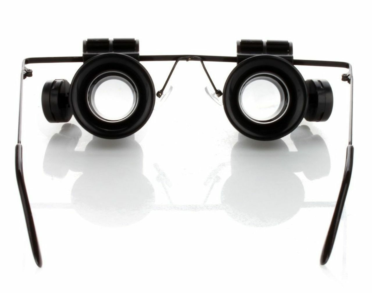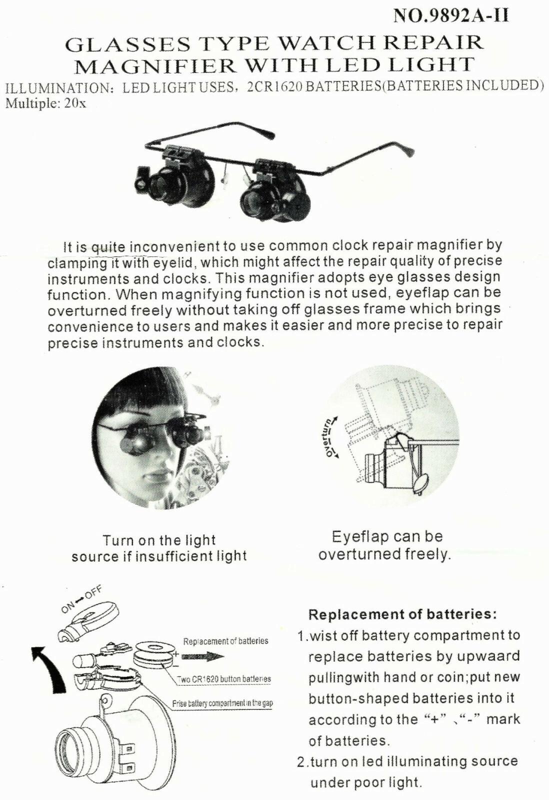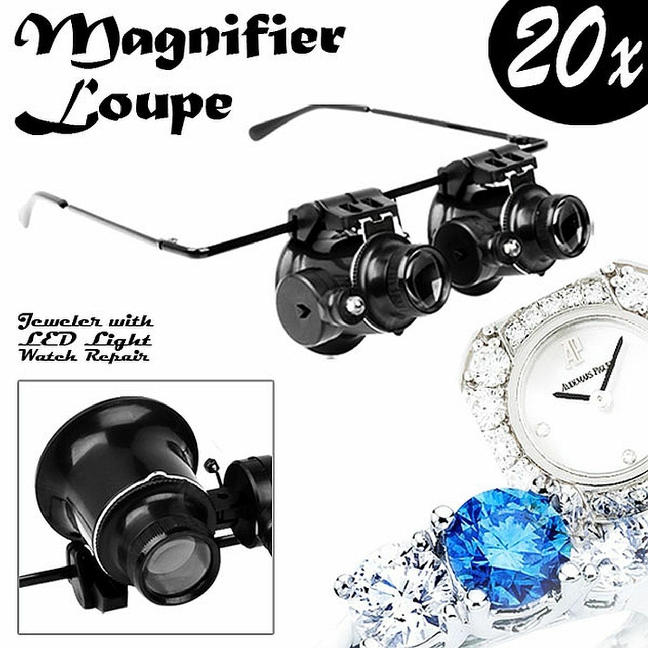 FOR SALE IS ONE (1) NEW DUAL LENS (left and right) 20X (20x = 20 power) MAGNIFYING GLASSES WITH LED LIGHTS AND BATTERIES MPN 9892A-ii UPC# 792363388962. THESE MAGNIFYING GLASSES ARE HIGHer POWER (20X) WITH A small VERY MAGNIFIED AND small FIELD OF VIEW, USED FOR VERRRRY CLOSE UP HANDS FREE VIEWING. NOT FOR READING OR GENERAL USE, MORE FOR REMOVING SPLINTER, EXAMINATION OF MICROSHIP OR DETAILED WORK OR EXAMINATION OF VERY SMALL PARTS, OR JEWELRY. USE THESE POWERFUL (20X = 20 power) )MAGNIFYING GLASSES WITH LED LIGHTS WHEN YOU REQUIRE HANDS FREE, LIKE WATCHMAKER OR DETAILED WORK. THIS EYEGLASSES STYLE DUAL MAGNIFIER WITH LED LIGHTS ON EACH SIDE ALLOWS YOU TO FREE YOUR HANDS SO YOU CAN WORK. THESE GLASSES ARE DESIGNED FOR 20X POWERFUL MAGNIFICATION AT A CLOSE DISTANCE, REMOVE A SPLINTER, EXAMINE A STAMP CLOSE UP, VIEW THE DOTS IN NEWSPAPER PRINT. MAGNIFICATION OF 20X (20 power) MAKES THIS A POWERFUL MAGNFIER WITH A LIMITED VIEW FIELD, NOT FOR READING OR GENERAL USE DUE TO THE HIGHer MAGNIFICATION OF 20X (20 power). USE LEFT SIDE, RIGHT SIDE OR BOTH SIDES, DUE TO THE FLIP UP FEATURE. UNIQUE METAL GLASSES FRAME WITH LEFT AND RIGHT FLIP UP LENS DESIGN LETS YOU VIEW ITEM WITH OR WITHOUT 20X (20x = 20 power) MAGNIFICATION, WITH OR WITHOUT LIGHT, EACH LENS FLIPS UP OR FLIPS DOWN INDIVIDUALLY DELIVERING POWERFUL 20X MAGNIFICATION. FITS COMFORTABLY JUST LIKE A PAIR OF GLASSES. ADJUSTABLE AND INDEPENDENT LED LIGHTS ON BOTH SIDES WITH INDEPENDENT SWITCHES FOR MORE CONTROL SINCE LIGHT IS VITAL TO EFFECTIVE MAGNIFICATION. EACH LED LIGHT USES TWO CR-1620 BATTERIES WHICH ARE INCLUDED. THIS DUAL LENS 20 power MAGNIFIER PROVIDES A RATHER HIGH 20X MAGNIFICATION WHICH IS MORE SUITABLE FOR PROJECTS WHERE HIGH MAGNIFICATION IS REQUIRED (great for removing a splinter). THE MOST COMMON MARNIFIERS PROVIDE 10X or 20X (10 or 20 power). THIS MAGNIFIER IS NOT SUITABLE FOR READING, THIS MAGNIFIER IS NOT ADJUSTABLE. WHEN YOU MAGNIFY MORE, YOU SEE LESS OF THE VIEWING AREA, WHICH IS THE CASE HERE (increased magnification = decreased viewing area). THESE ARE NOT SUITABLE FOR READING, WHERE YOU MAY DESIRE 2, 3 or 5 POWER MAGNIFICATION, THESE SPECIALTY GLASSES ARE DESIGNED FOR AN very CLOSE UP VIEW. JUST LIKE A HIGHER POWER JEWELERS LOUPE, HIGH MAGNIFICATION REQUIRES THE MAGNIFIED ITEM BE HELD VERY CLOSE TO LENS AREA(S). GREAT FOR WORKING ON WATCH, CLOCK REPAIR, PRECISION INSTRUMENTATION, ELECTRONICS, JEWELRY, COINS, STAMPS, SMALL PARTS, ELECTRONICS. THIS MAGNIFIER ALLOWS YOU TO REMOVE A SPLINTER USING BOTH HANDS. FOR THE WORKER WHO IS ENGAGED IN MAGNIFICATION MORE THAN A FEW MINUTES A DAY, THIS DUAL LENS 20X MAGNIFIER WITH LED LIGHTS WILL SAVE YOUR EYES, NECK, AND BRAIN, MAKING THE PROCESS MORE COMFORTABLE AND ERGONOMIC SINCE YOU NOW HAVE THE ABILITY TO USE BOTH HANDS. YOU WILL RECEIVE ONE PAIR OF 20 power MAGNIFYING GLASSES WITH LED LIGHTS AND BATTERIES SHIPPED BY USPS.....