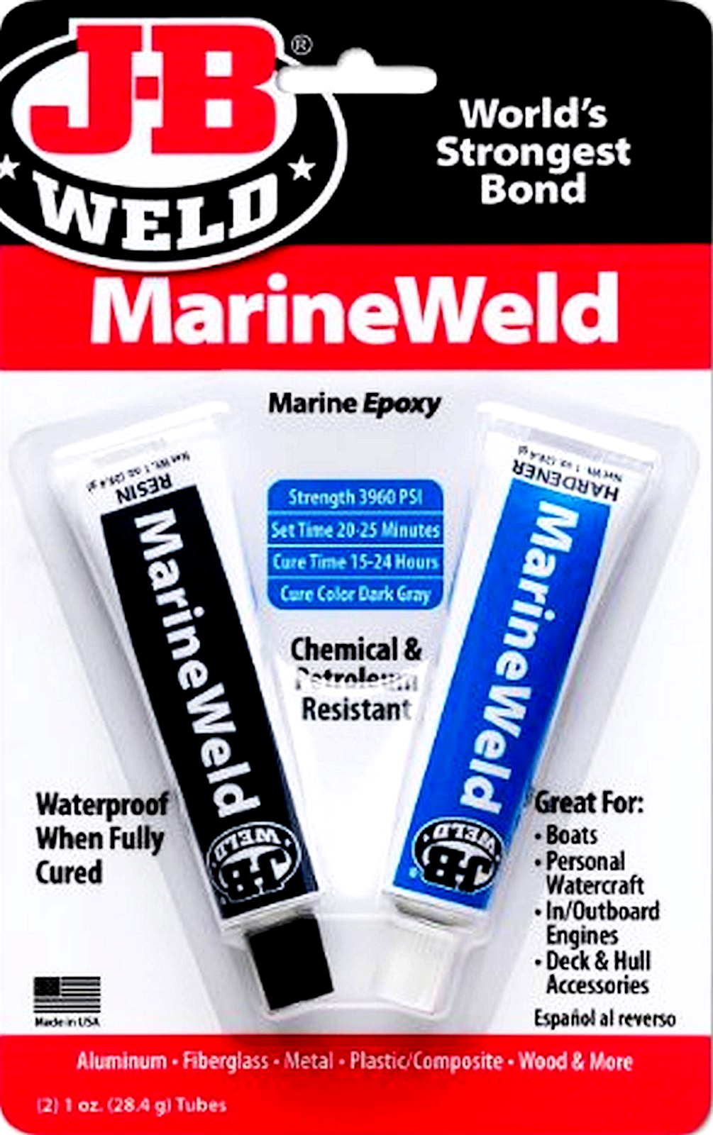 FOR SALE IS ONE (1) NEW PACKAGE OF MarineWeld MARINE GRADE TWO part EPOXY MANUFACTURED MANUFACTURED BY J-B WELD COMPANY MPN 8272 UPC# 043425082725. ALWAYS SOLD FACTORY FRESH, NET WEIGHT 2oz = 57 grams, MADE IN USA. J-B WELD MarineWeld IS A SPECIALLY FORMULATED TWO PART EPOXY COLD WELD SYSTEM THAT PROVIDES FOR STRONG, LASTING REPAIRS FOR BONDING DIFFERENT OR SIMILAR SURFACES, SUCH AS METAL, COMPOSITES, FIBERGLASS, PLASTIC, AND MANY OTHERS. MarineWeld BY J-B WELD IS RESISTANT TO CHEMICALS, GASOLINE AND PETROLEUM. MarineWeld BY J-B WELD SETS IN 25 MINUTES AT ROOM TEMPERATURE AND IS FULLY CURED TO A DARK GREY COLOR IN 15-24 HOURS. ONCE CURED, IT CAN BE SHAPED, TAPPED, FILED, SANDED AND DRILLED AND WILL RETAIN IT'S STRENGTH ABOVE OR BELOW THE WATERS' SURFACE. MarineWeld HAS A 1:1 MIXING RATIO AND TENSILE STRENGTH OF 3960 PSI (pounds per square inch). READ ABOUT THE MANY APPLICATIONS BELOW. YOU WILL RECEIVE ONE NEW PACKAGE OF JB WELD BRAND MarineWeld MARINE EPOXY SHIPPED BY USPS.....